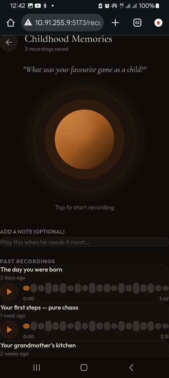 - Guided voice recording across 6 life chapters: childhood, young adult, parenthood, wisdom, values, and sealed letters for the future