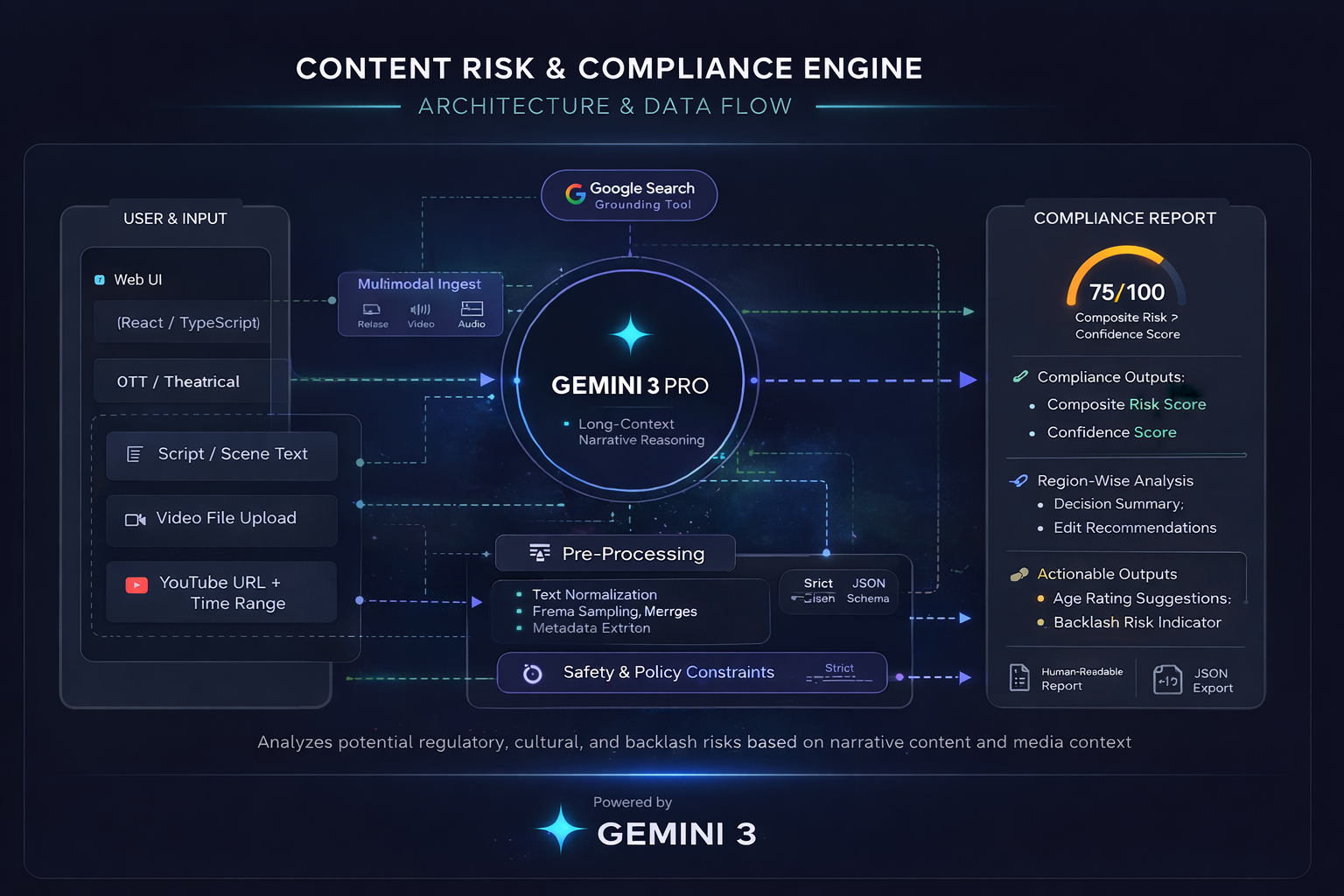 This project directly uses Gemini APIs for: Multimodal reasoning (text + visual understanding) Long-context narrative analysis Region-specific conditional reasoning Structured JSON generation Explainable AI outputs Optional grounding via Google Search Gemini is used as a decision intelligence engine, not a simple prompt wrapper or classifier. Impact & Use Cases. We used system instructions too in the app to direct the AI on how to think.