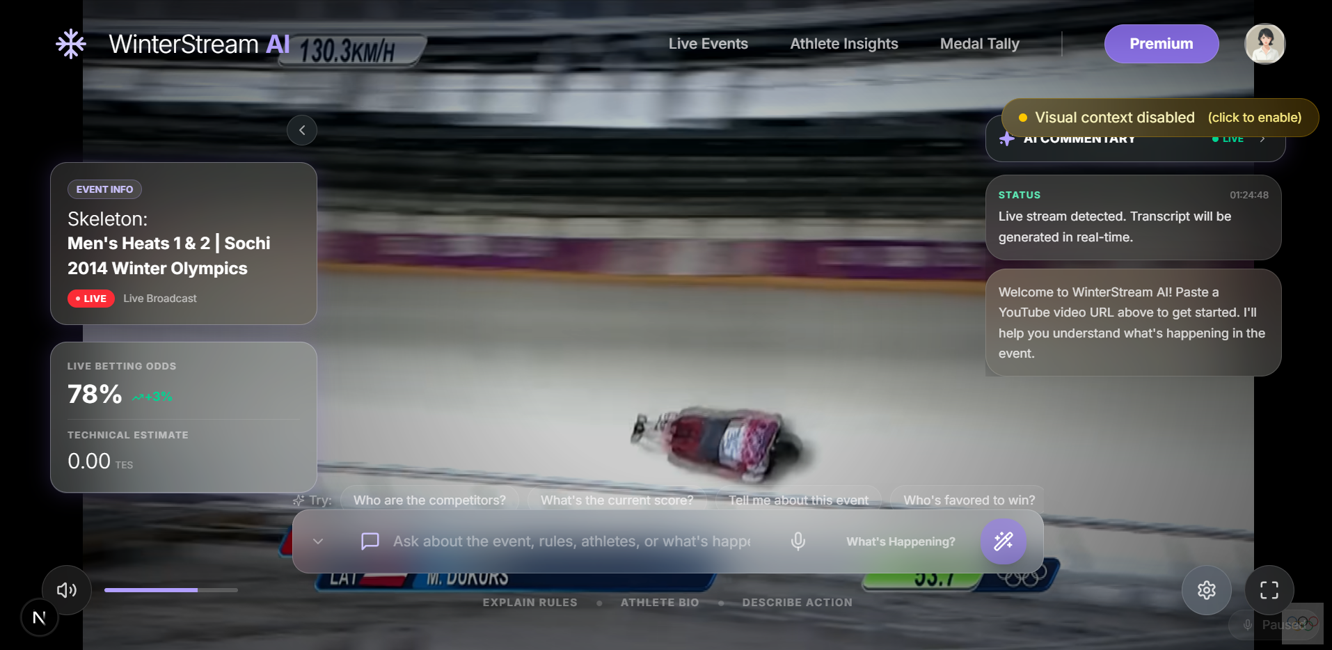 WinterStream AI was born from a desire to make sports streaming more accessible to everyone — especially for blind or visually impaired users and newcomers to Winter Olympic sports. Traditional livestreams often rely on visuals that aren’t easily interpreted without sight, so we set out to pair event video with real-time AI-generated commentary and voice responses, letting users hear the action and ask questions naturally.