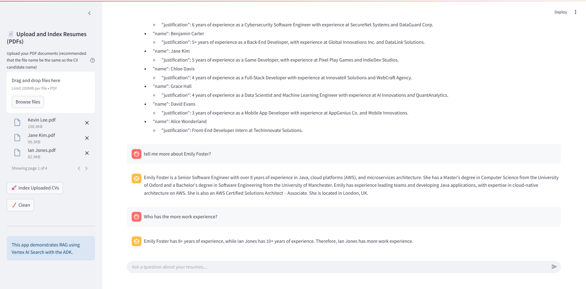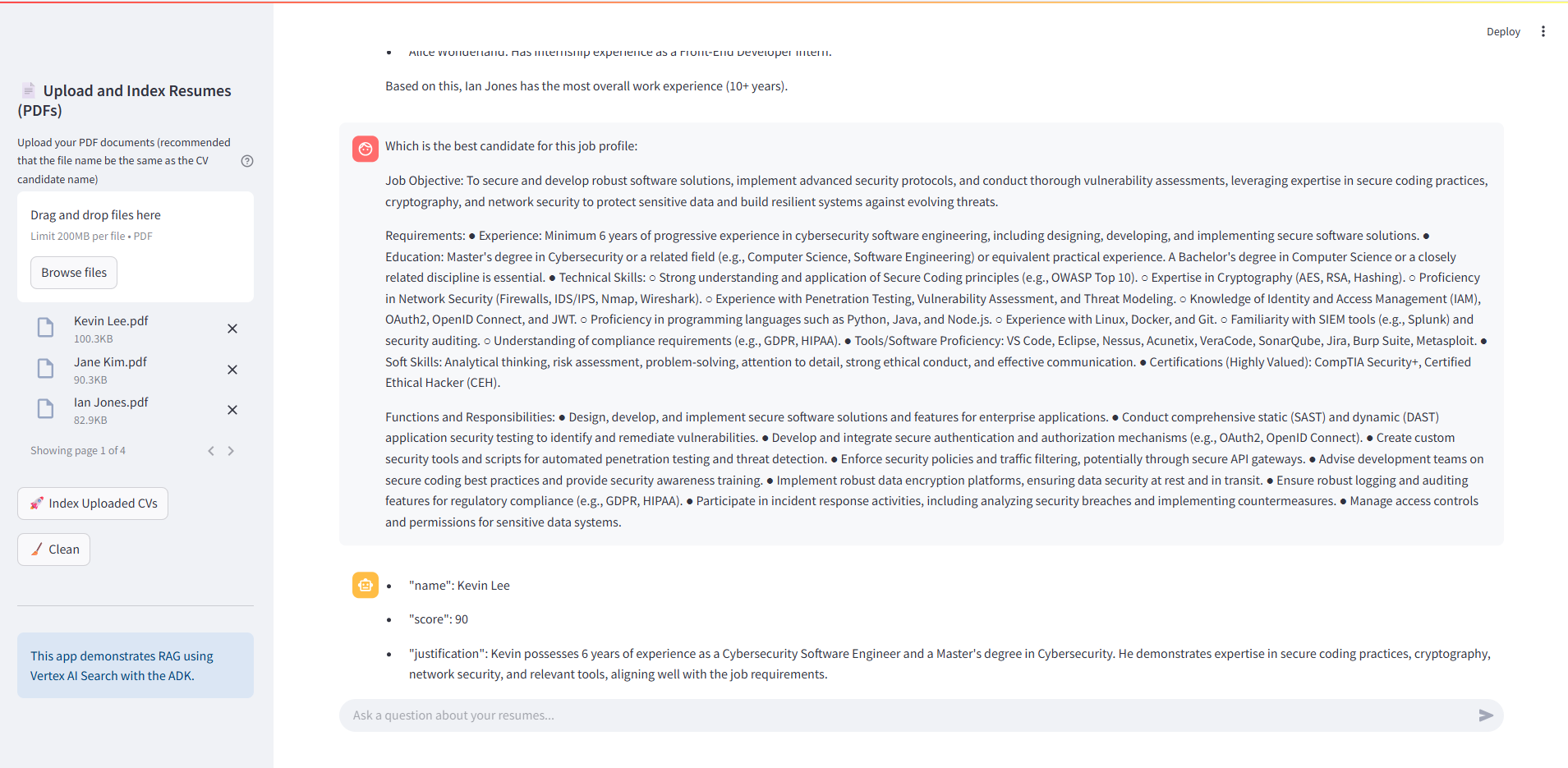 From a given .pdf files, in this cases, Resumes, the application is able to suggest the best CVs for a new open job position or just do quick searches on these files in a chat mode.