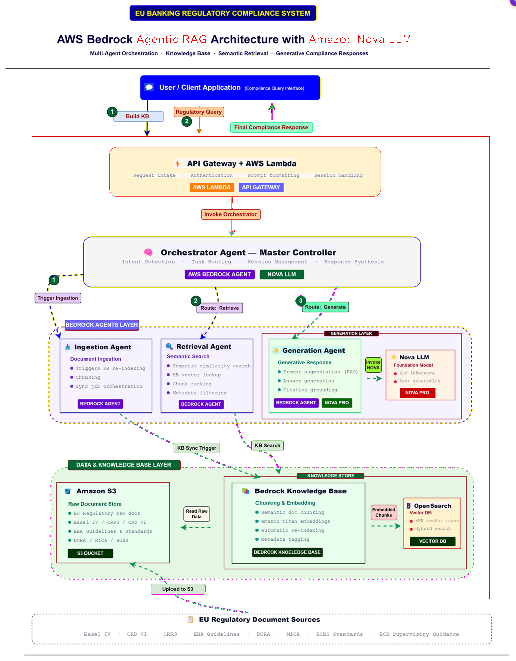 The platform is an AI‑driven regulatory decision system that automates research, accelerates compliance decisions, and reduces misinterpretation risk. Key capabilities: Agentic RAG Engine leveraging AWS Bedrock to ingest, normalize, and enrich EU regulatory content. Specialized AI agents for ingestion, retrieval, reasoning, and validation. Traceable answers - every response includes citations, evidence, and links to source paragraphs. Continuous learning pipeline automatically updates the knowledge base with new regulatory releases. Enterprise‑grade compliance insights across Basel IV, DORA, CRD VI, BCBS, EBA, ECB, GDPR, PSD2. In simple terms: Manual Research Time (70%)->AI Automated Insights (10% or less)