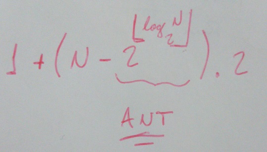 However, I thought that it was a bit too hard and noticed that I was going from the higher numbers down to smaller ones (16-15-14-...). I then started going the other way, and found out the second_guess (ANT in the formula refers to the power of two number that predates N), but for that I had to had the Powers of two table, which contains "all" numbers that are a power of two, in order to acquire ANT.