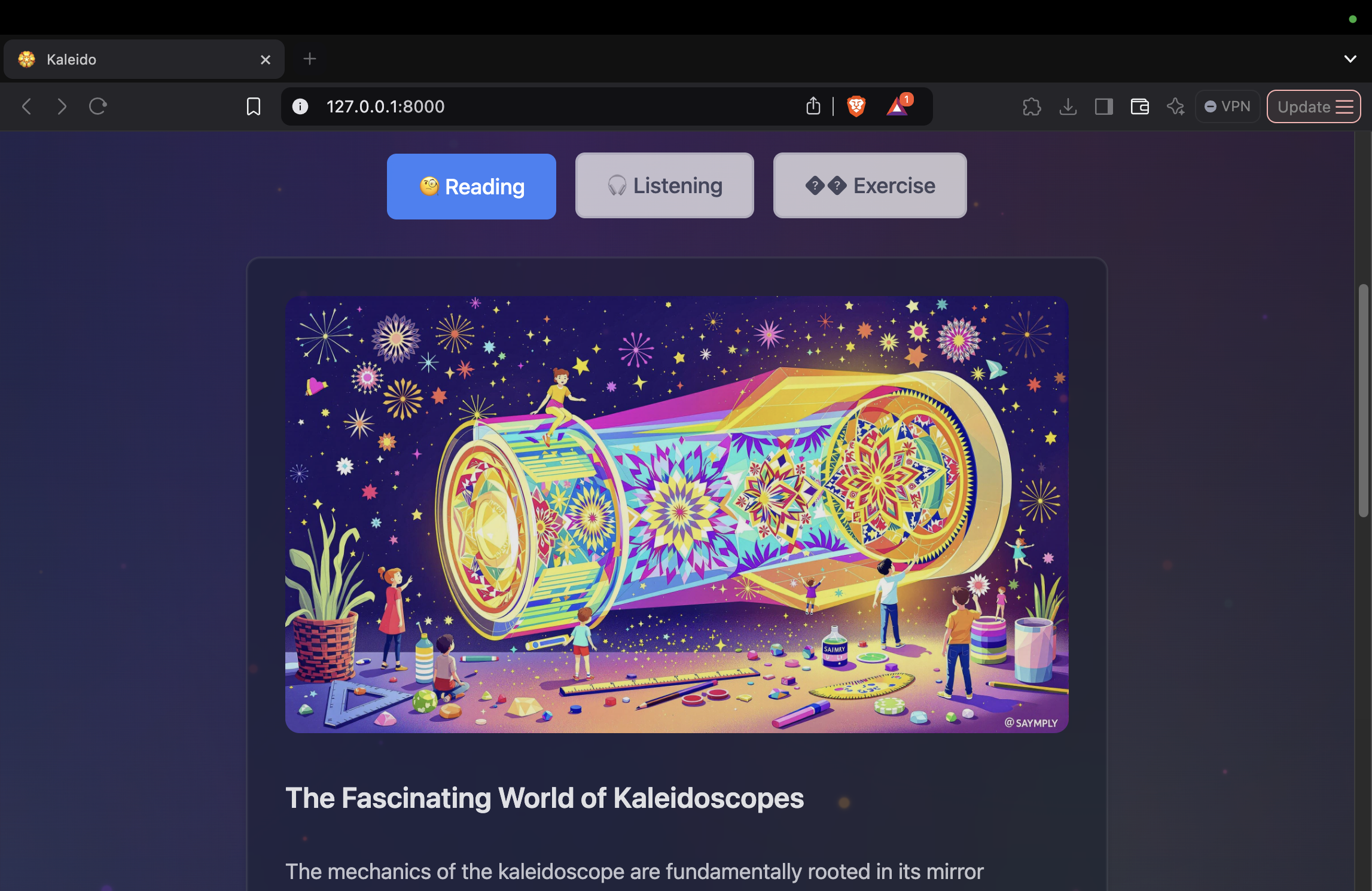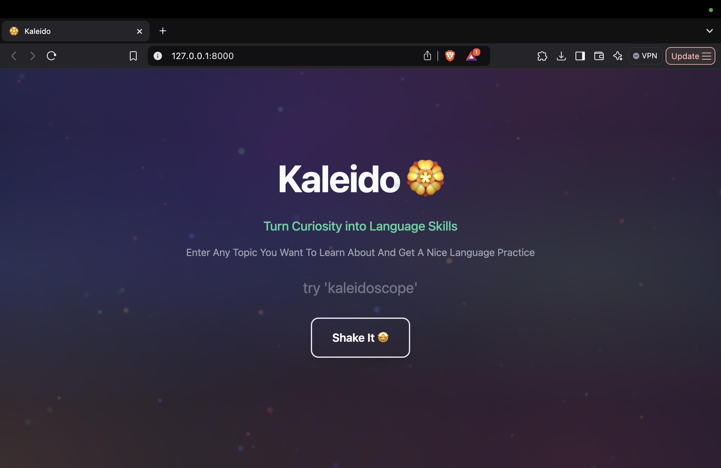 This experience inspired me to create Kaleido. I wanted to flip the traditional language learning model on its head: instead of forcing students to learn language through predetermined topics, why not let them learn through topics they're actually curious about?