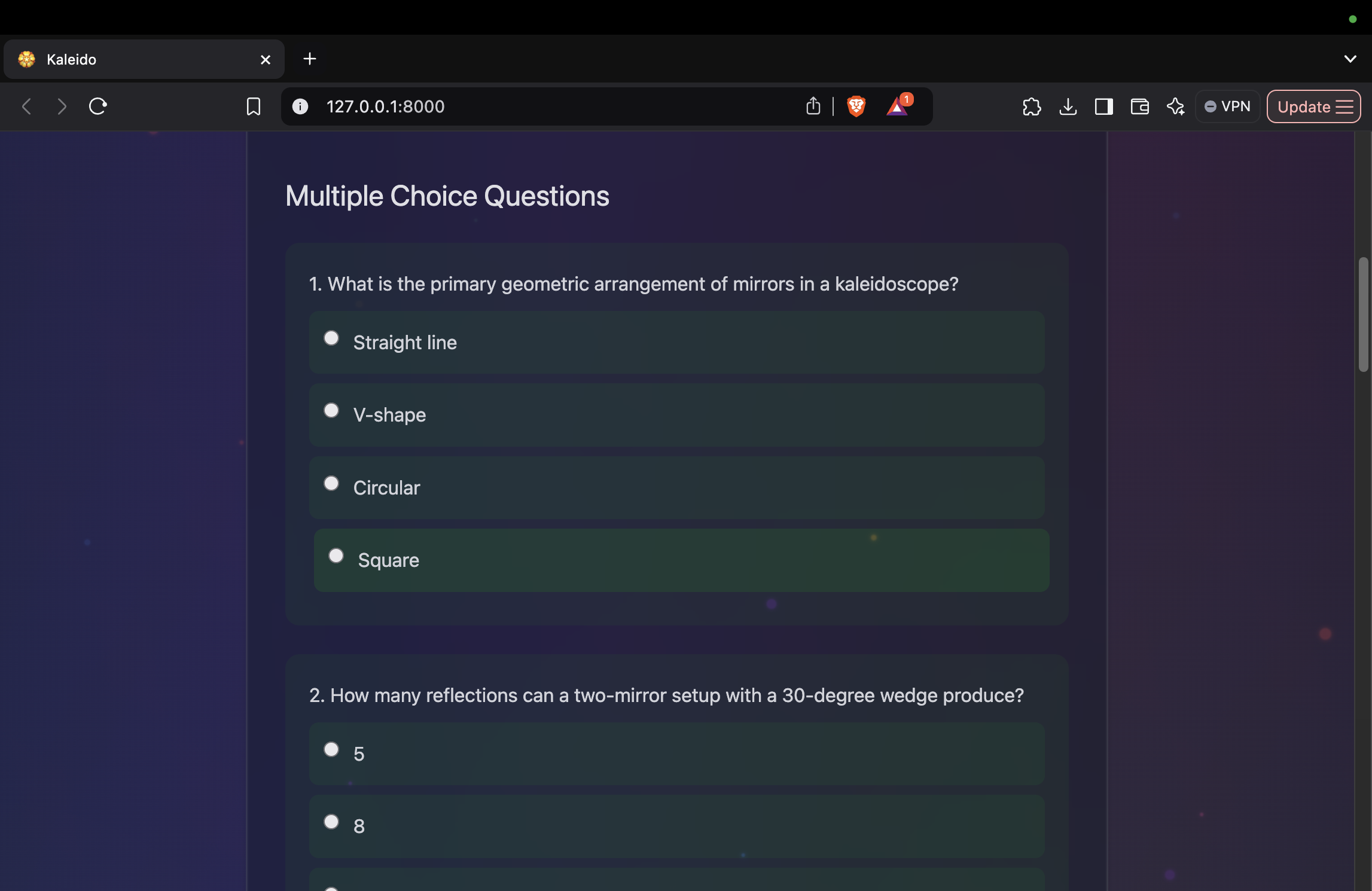 The name "Kaleido" comes from kaleidoscope—a device that creates beautiful, ever-changing patterns. Similarly, this app creates unique learning experiences from whatever subject interests the learner at that moment.