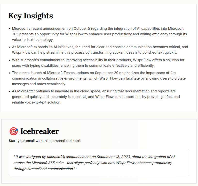 ✅ Generates personalized emails with citations, icebreakers, and context
