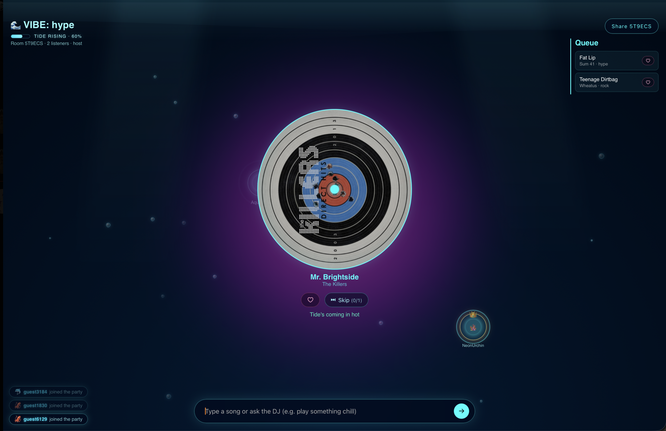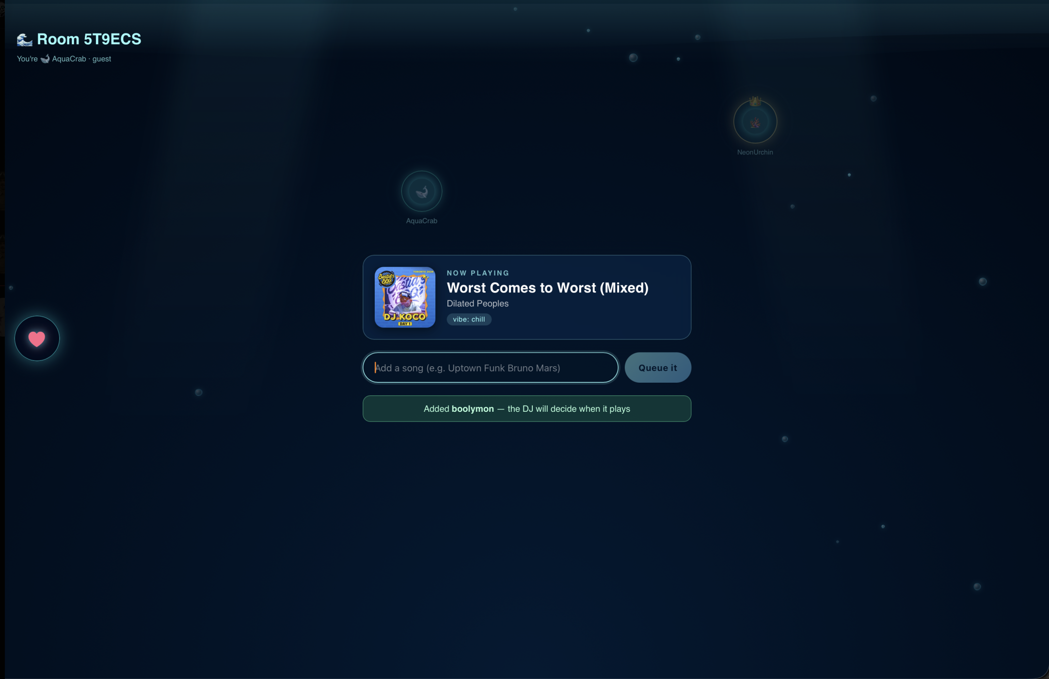 Music has always been a social experience—but the way we listen together online is still broken. Most platforms either rely on one person controlling the queue or reduce music sharing to passive playlists with no real interaction. We were inspired by the idea of making music feel alive in shared spaces again. In real-life settings like parties, hangouts, or study sessions, the vibe constantly shifts based on people’s energy, conversations, and mood. But existing tools don’t adapt to that in real time. That’s where the idea for an AI DJ came in. We wanted to build something that could: Understand the collective vibe of a group React to real-time chat and energy changes Dynamically adapt the music queue automatically Make shared listening feel interactive, intelligent, and human again Instead of users manually curating playlists or fighting over control, the AI DJ acts like a real DJ in a room—listening, interpreting, and responding to the crowd’s mood instantly.