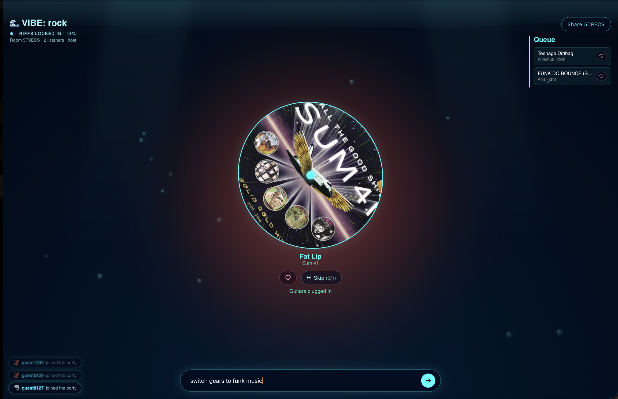 Guest Page- User requests song that is added to the queue or shares the vibe they are feeling