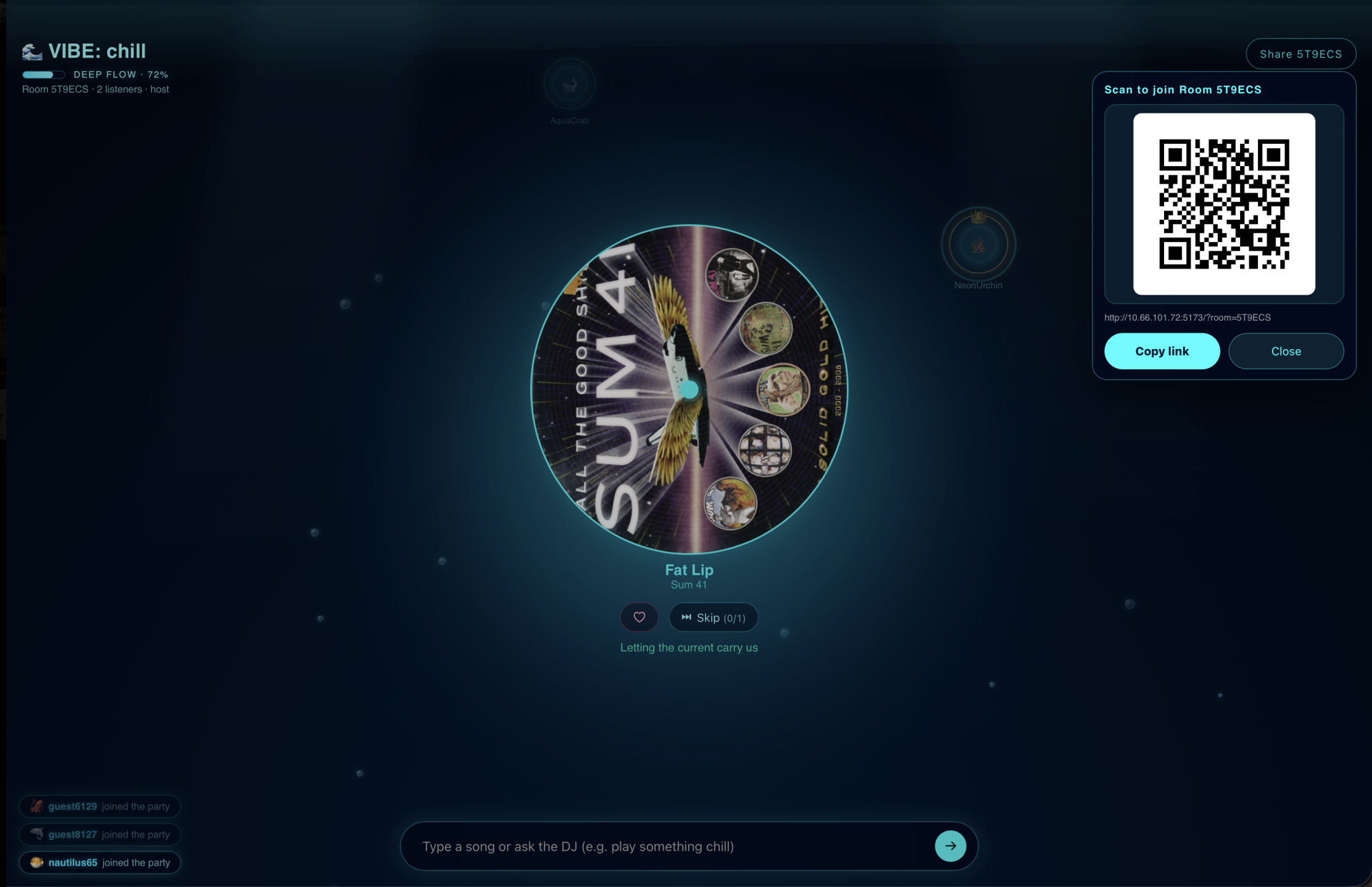 One major challenge was maintaining a real-time song queue that stays synchronized across all users while also updating dynamically based on AI-generated “vibe” and user input. Balancing automation with user control took multiple iterations. We also struggled with AI-based song selection, making sure the system chose songs that actually matched the room’s mood rather than feeling random. Another issue was music playback. We initially tried using Spotify but faced API restrictions, so we switched to the Apple iTunes Search API, which provides public previews and made playback much easier. Building real-time rooms with hosts and multiple users was also complex, especially ensuring smooth joining, queue updates, and state synchronization. Additionally, sticking to our deep-sea theme across the UI and experience was harder than expected—we had to keep the design consistent while still making the interface intuitive and responsive. Lastly, we ran into merge conflicts during development, which we solved by using a better branching workflow for collaboration.