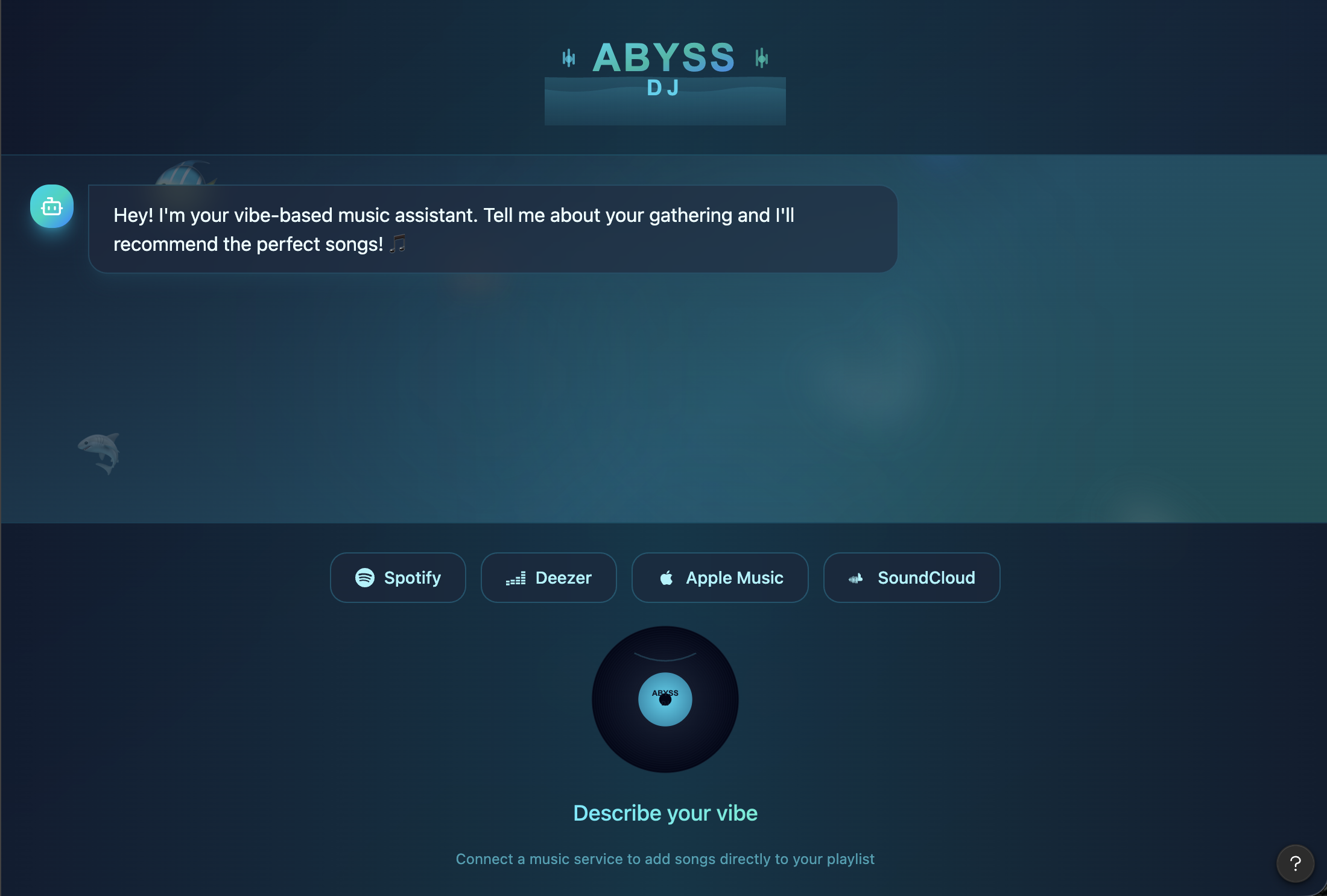 Abyss Vibe DJ is an AI-powered social music platform that turns group listening into a real-time, interactive experience. Users join shared rooms where they can chat, influence the vibe, and listen together while an AI DJ dynamically builds and controls the music queue. The AI analyzes user input and conversation context to understand the room’s mood, then automatically selects and queues songs that match the collective energy. Instead of manually picking tracks, users interact naturally through chat while the system adapts the playlist in real time. Each room stays perfectly synchronized across all users using real-time updates, so everyone hears the same moment at the same time—just like a live DJ set
