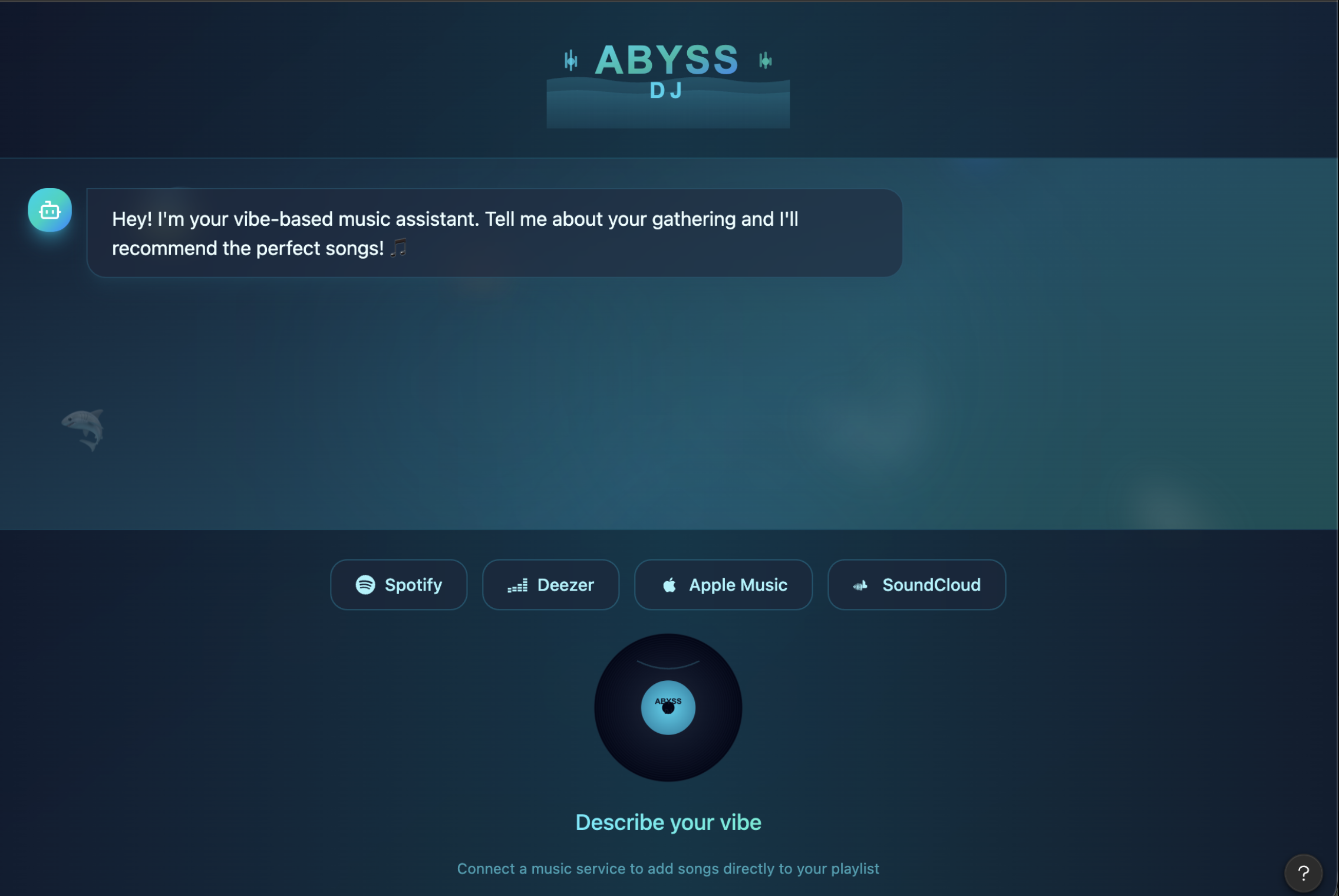 Abyss Vibe DJ is built as a full-stack real-time web application using a JavaScript-based architecture across both frontend and backend. On the backend, we used Node.js with Express to handle REST API routes for room creation and health checks. Real-time communication is powered by Socket.io, which manages live music rooms, synchronized playback, chat events, and dynamic DJ queue updates. We used dotenv for environment configuration and the native Fetch API to connect to external services like the Google Gemini API and Apple iTunes Search API. On the frontend, we built the interface using React, bundled and served with Vite for fast development and hot module reloading. The client connects to the backend through socket.io-client, enabling real-time updates for music, chat, and room state. We also used qrcode.react to generate shareable QR codes so users can instantly join rooms from their phones or other devices. For styling, we kept things lightweight with plain CSS, focusing on a smooth, immersive “vibe-based” UI instead of heavy frameworks. The AI DJ logic is powered by the Google Gemini API, which interprets chat context and user input to determine the room’s mood and suggest or adjust music accordingly. Music metadata and previews are pulled from the Apple iTunes Search API, giving access to track information and 30-second audio clips used in the queue. Overall, the system is designed around a real-time event-driven architecture where Socket.io synchronizes all users, while AI and external APIs dynamically shape the listening experience.
