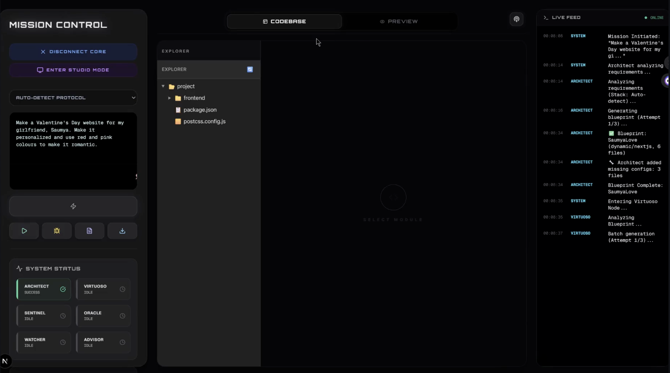 Instead of generating isolated code snippets, it accepts a high-level instruction and executes it as a complete engineering task. The system plans the architecture, generates the codebase, validates functionality, enforces security, and repairs failures autonomously.