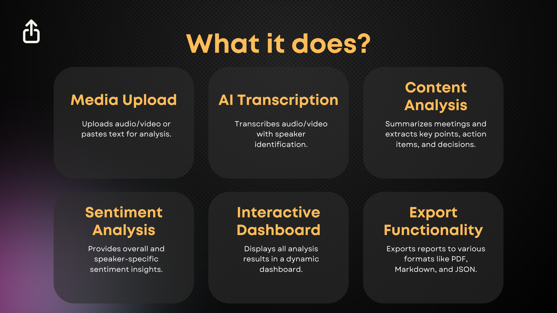 - Content Analysis: Generates summaries, extracts action items, identifies decisions, and analyzes sentiment using AI.