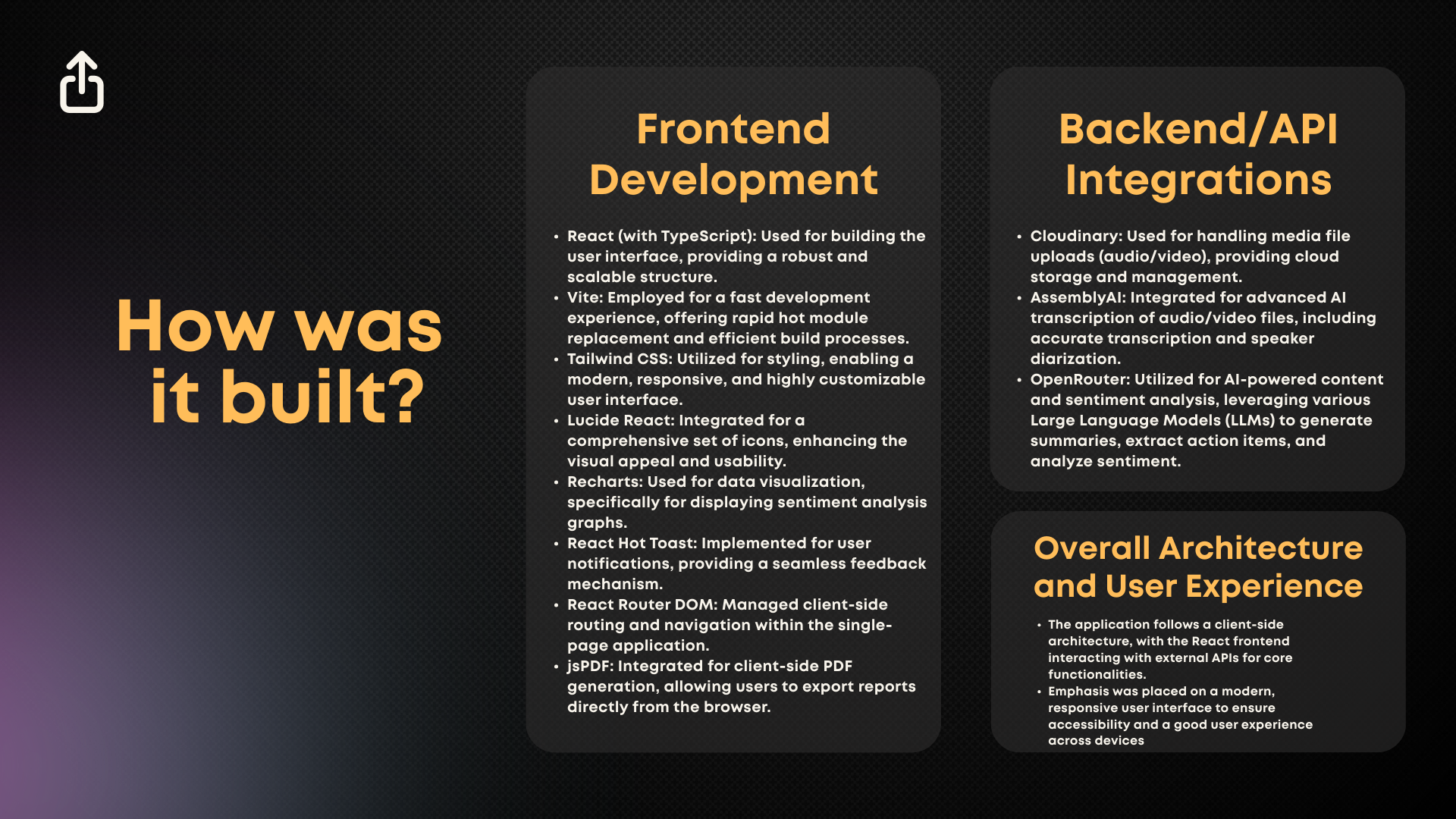 - Interactive Dashboard: Dynamic dashboard with dedicated tabs for summaries, transcripts, action items, and sentiment insights.