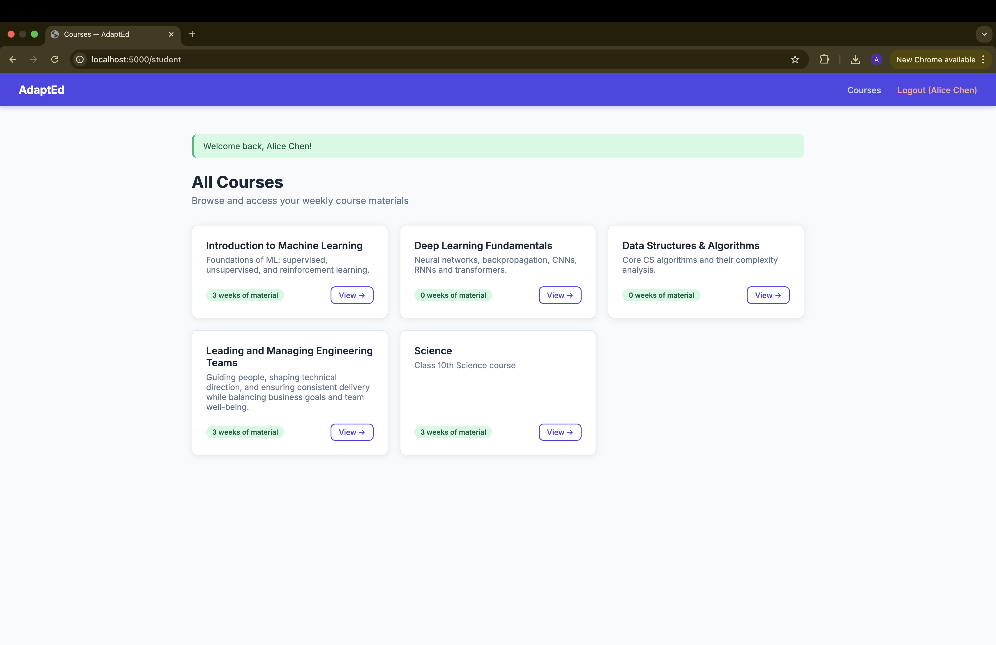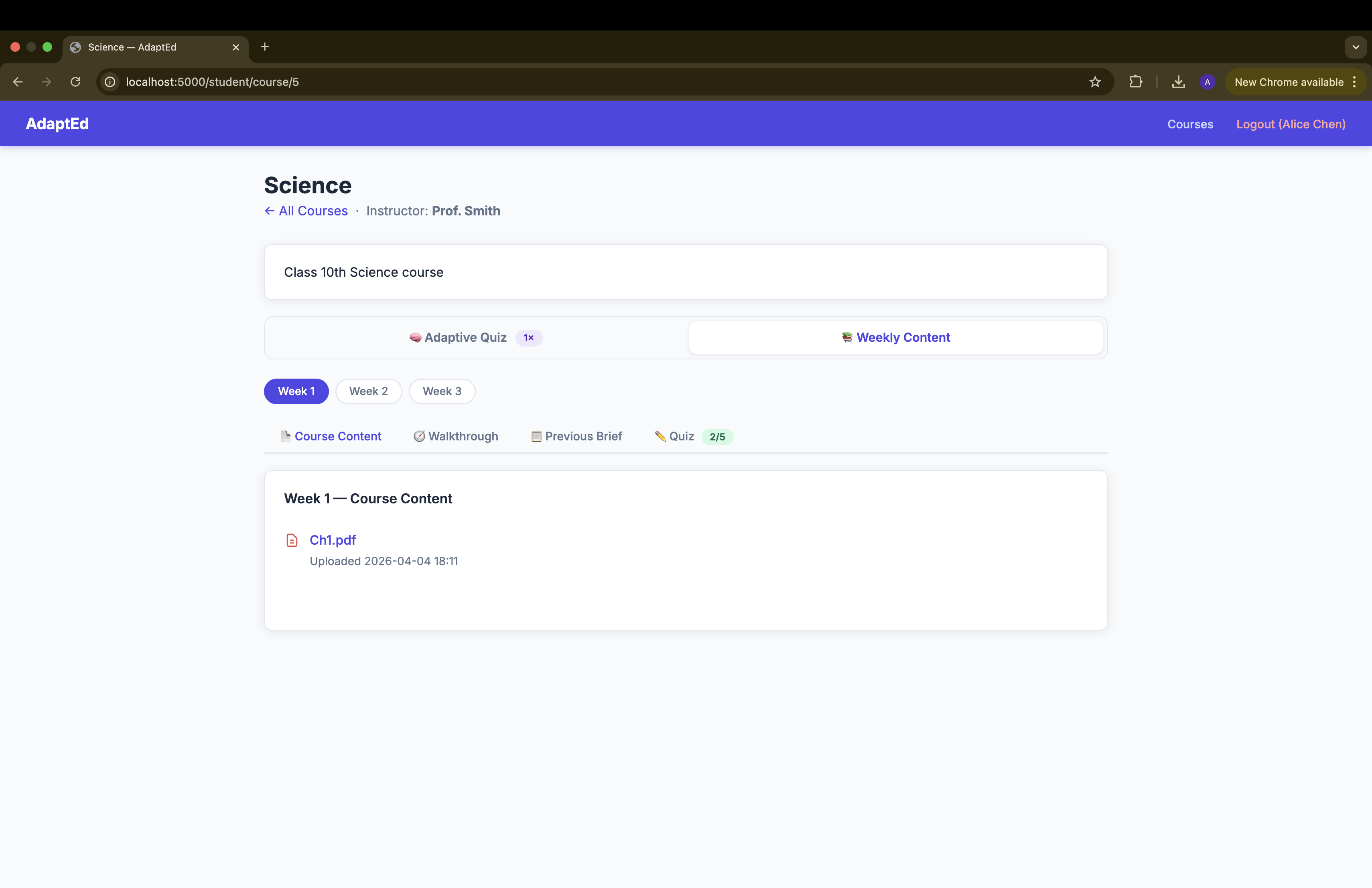 AdaptEd is an AI-powered learning companion that turns course materials into personalized learning experiences. Instructors upload a PDF, and students get structured summaries, guided walkthroughs, and adaptive quizzes that evolve based on their mistakes—helping them retain concepts more effectively.