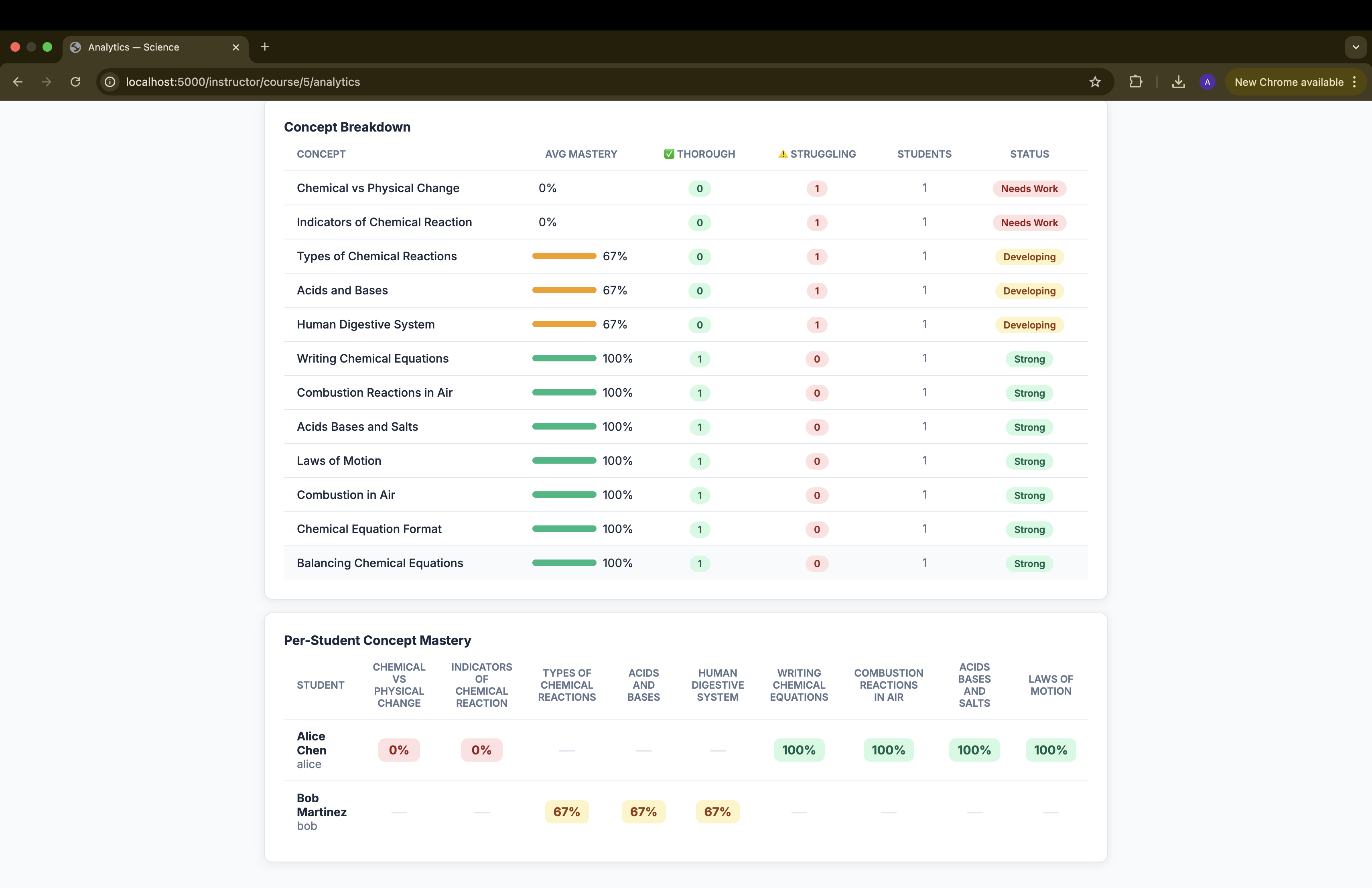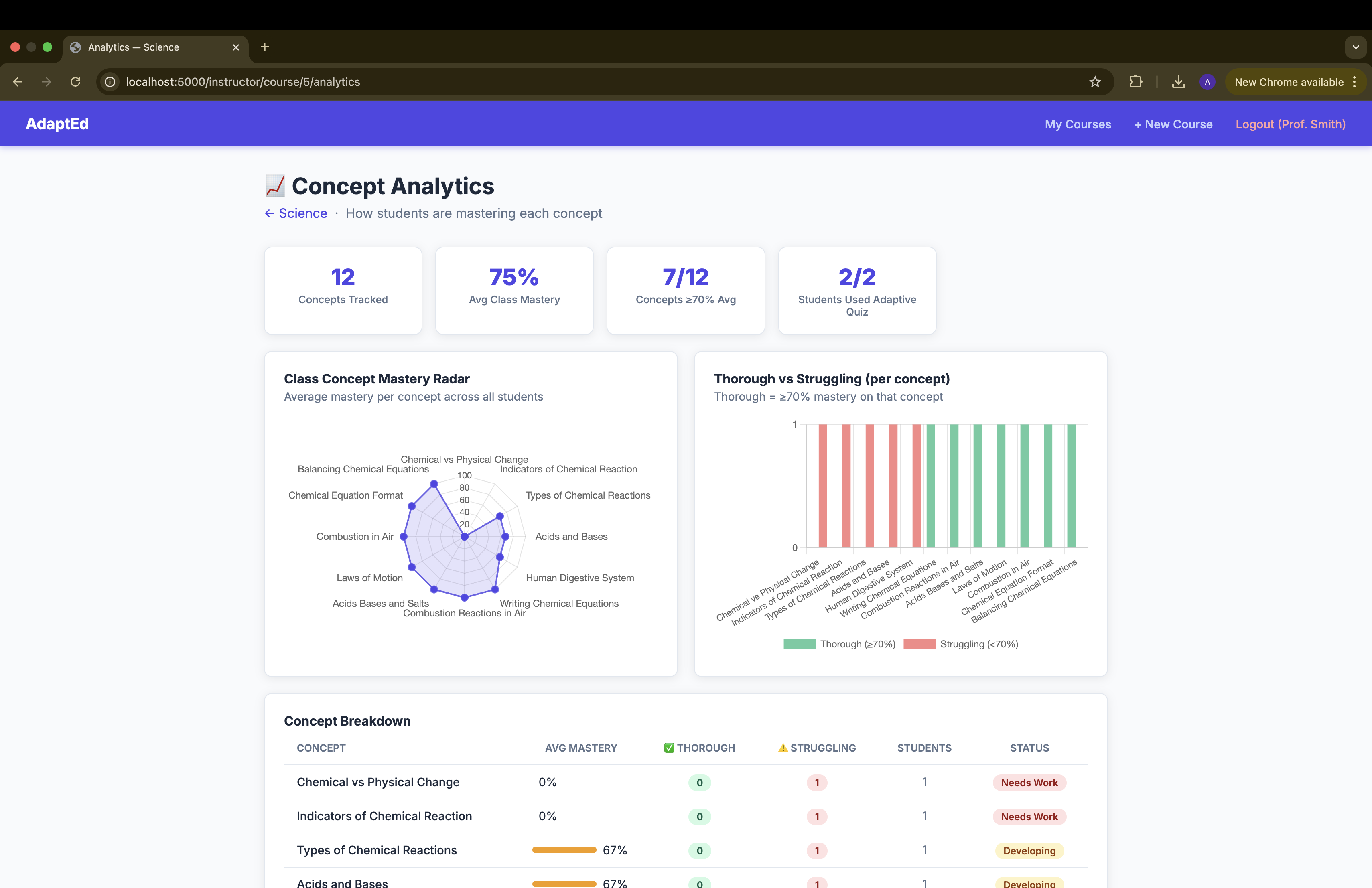base64document content blocks, so Claude reads the actual material rather than relying on filenames or summaries. -Concept tracking — every Adaptive Quiz answer is tagged with a concept label (returned by Claude in JSON). Correct/incorrect results update a per-student, per-course concept ledger stored inconcepts.json, enabling the instructor analytics view. -Analytics use Chart.js (CDN) to render a radar chart of class-wide concept mastery and a grouped bar chart of thorough vs. struggling students per concept — all computed server-side from the JSON store.