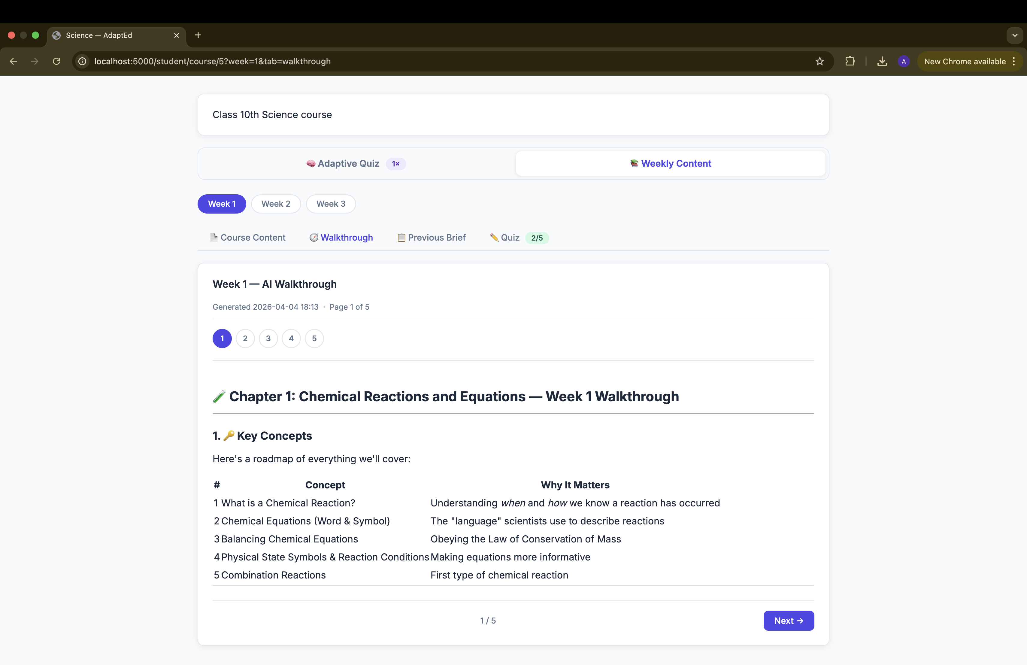 - Adaptive Quiz — Claude analyses the student's per-concept mastery scores and mistake history across all weeks, then generates questions targeting the weakest concepts and few more for general revision. Retakeable; each session updates concept mastery