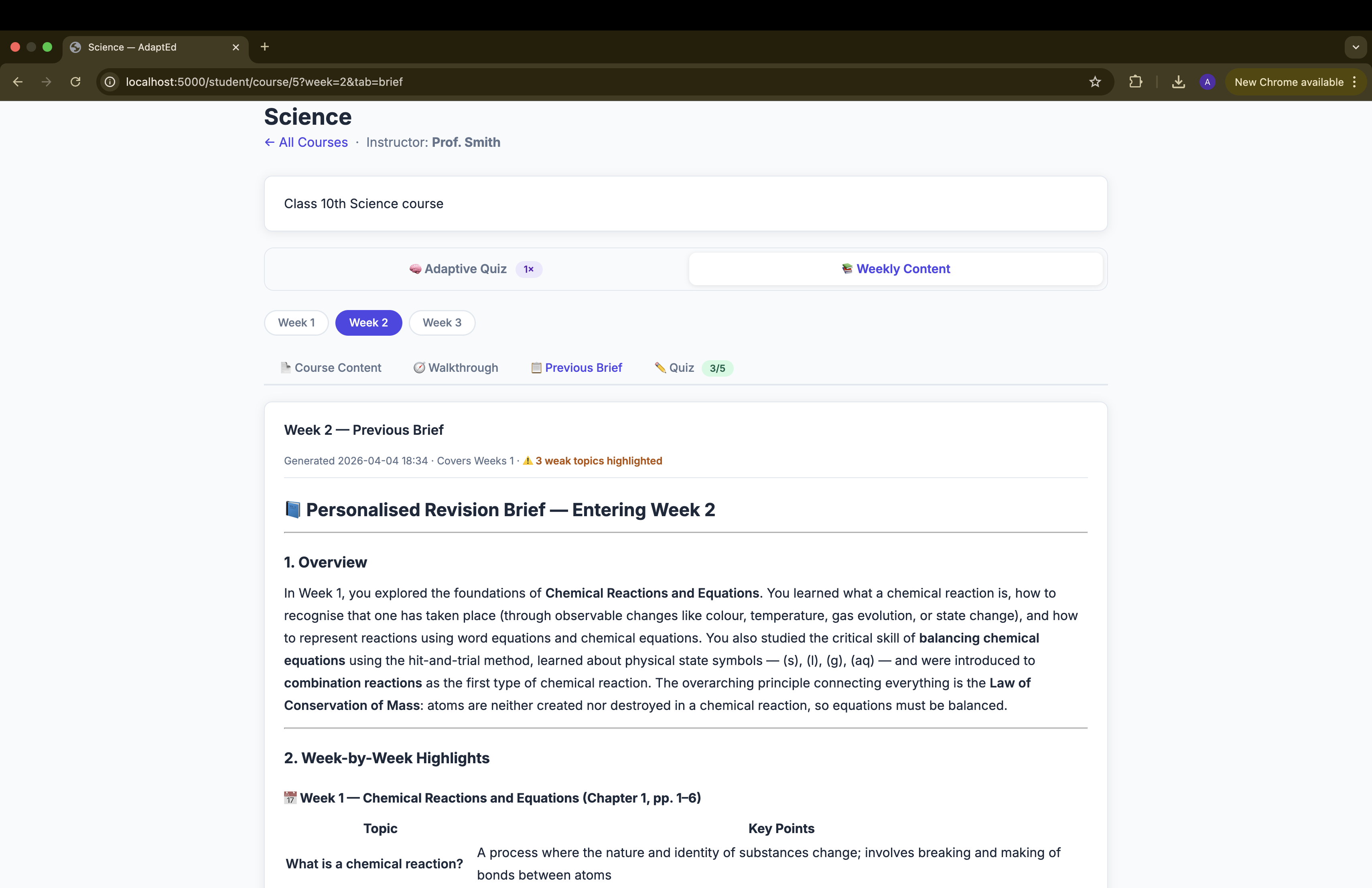 End-to-end personalisation loop — a student's wrong answers in Week 1's quiz influence the Previous Brief for Week 2, the questions in Week 2's quiz, and every future Adaptive Quiz session. The system actually learns from each student individually.