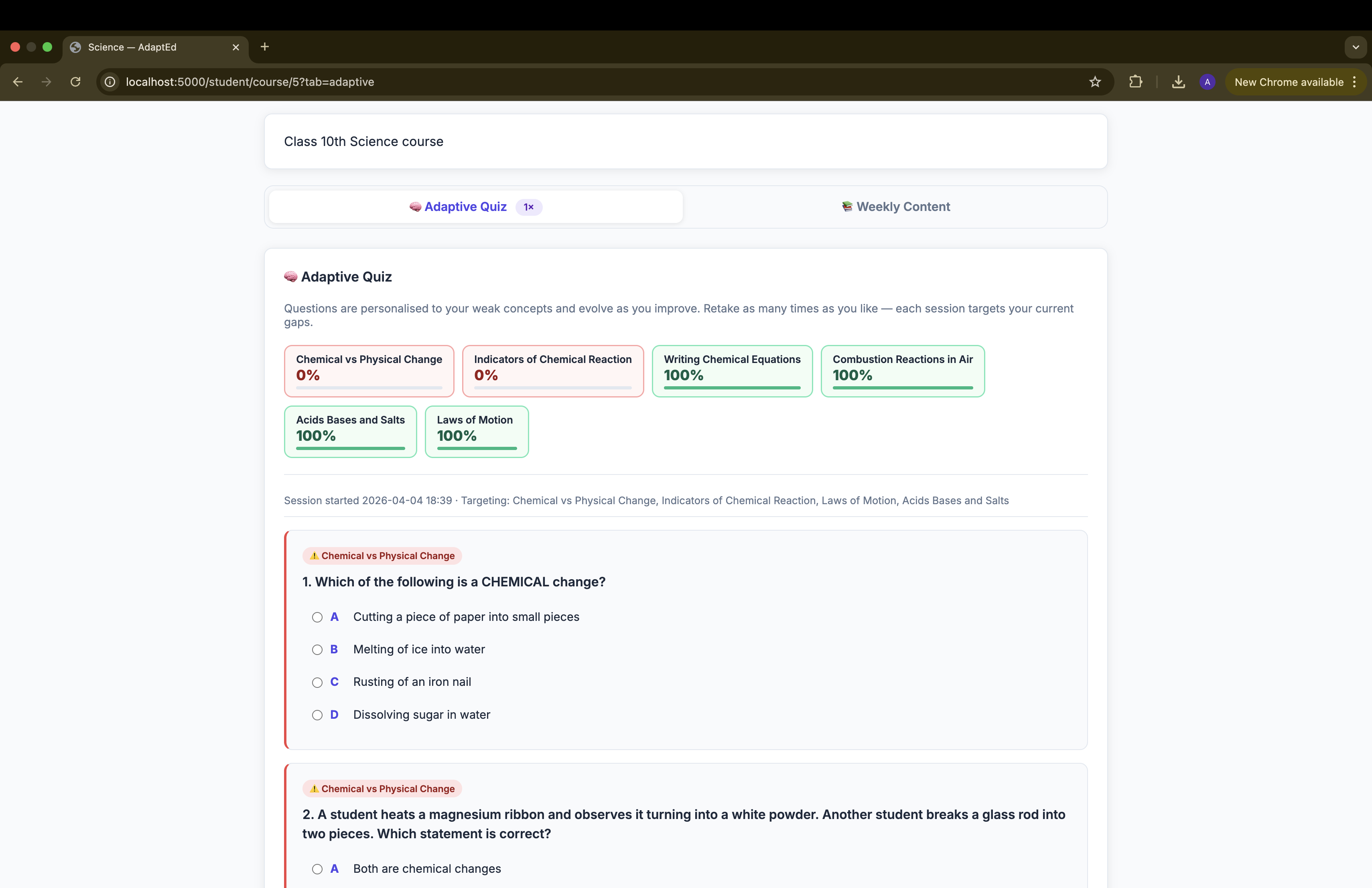 Adaptive quiz cold-start — students with no prior quiz history had nothing to base personalisation on. We handled this gracefully by gating the Adaptive Quiz behind at least one completed weekly quiz, and progressively enriching the prompt as concept data accumulates.