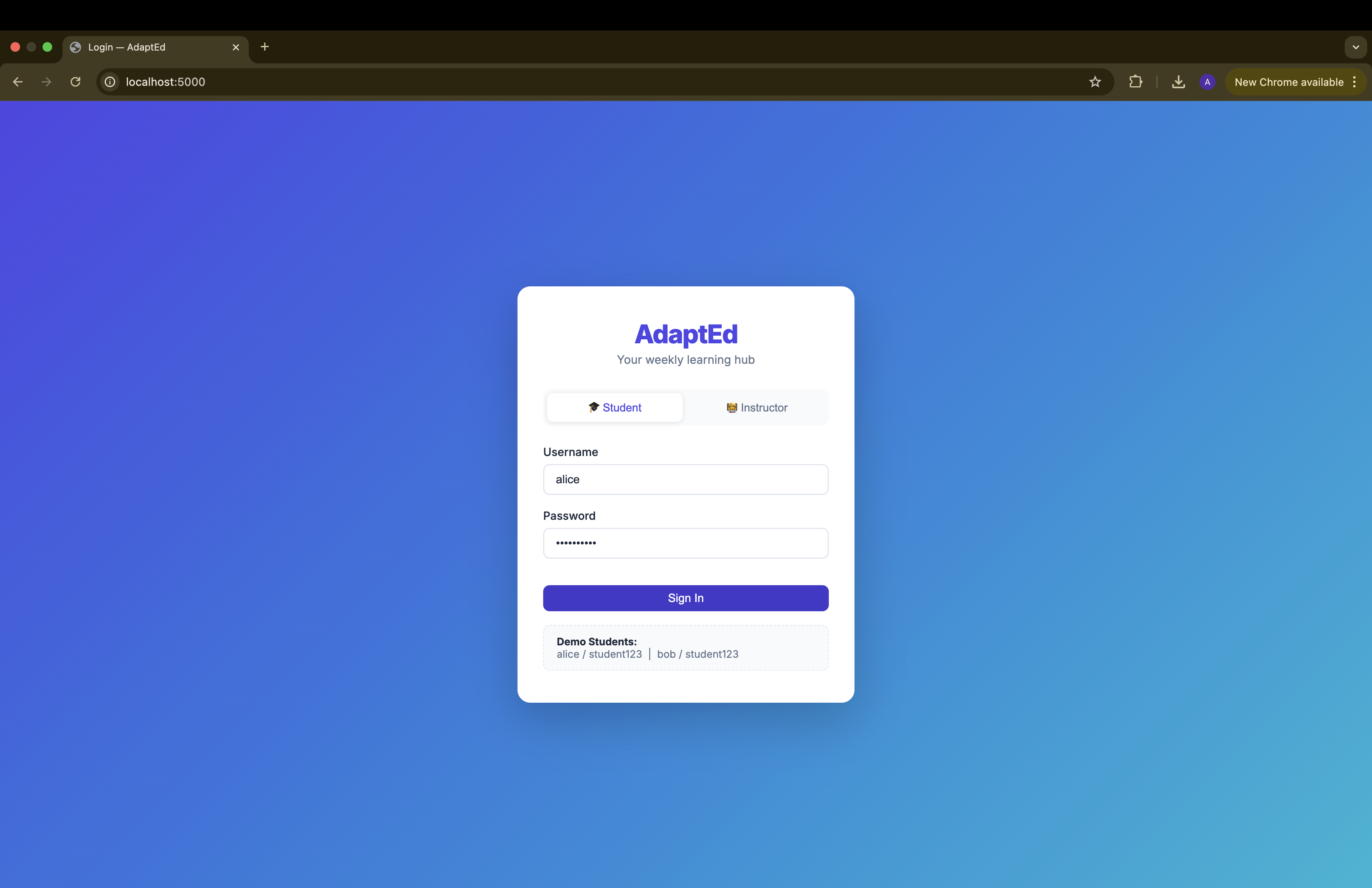 AdaptEd is built as a lightweight, full-stack Python/Flask application designed to simulate an AI-powered learning layer on top of an LMS like Brightspace.
