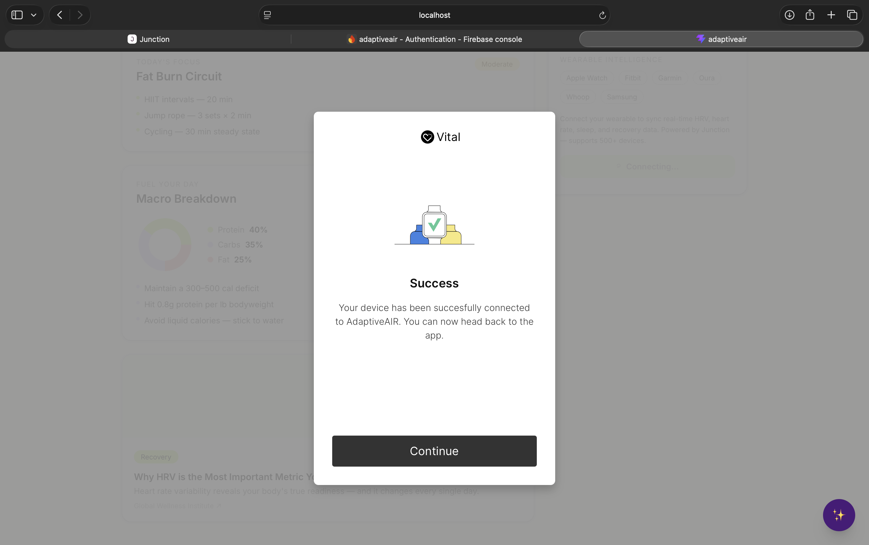 - No wearable has a web API for direct browser access. Apple HealthKit is iOS-only, Google Health Connect is Android-only. We solved this by integrating Junction's unified API which handles OAuth for cloud-connected devices (Fitbit, Garmin, Oura, Whoop) and provides mobile SDKs for Apple Health/Samsung.