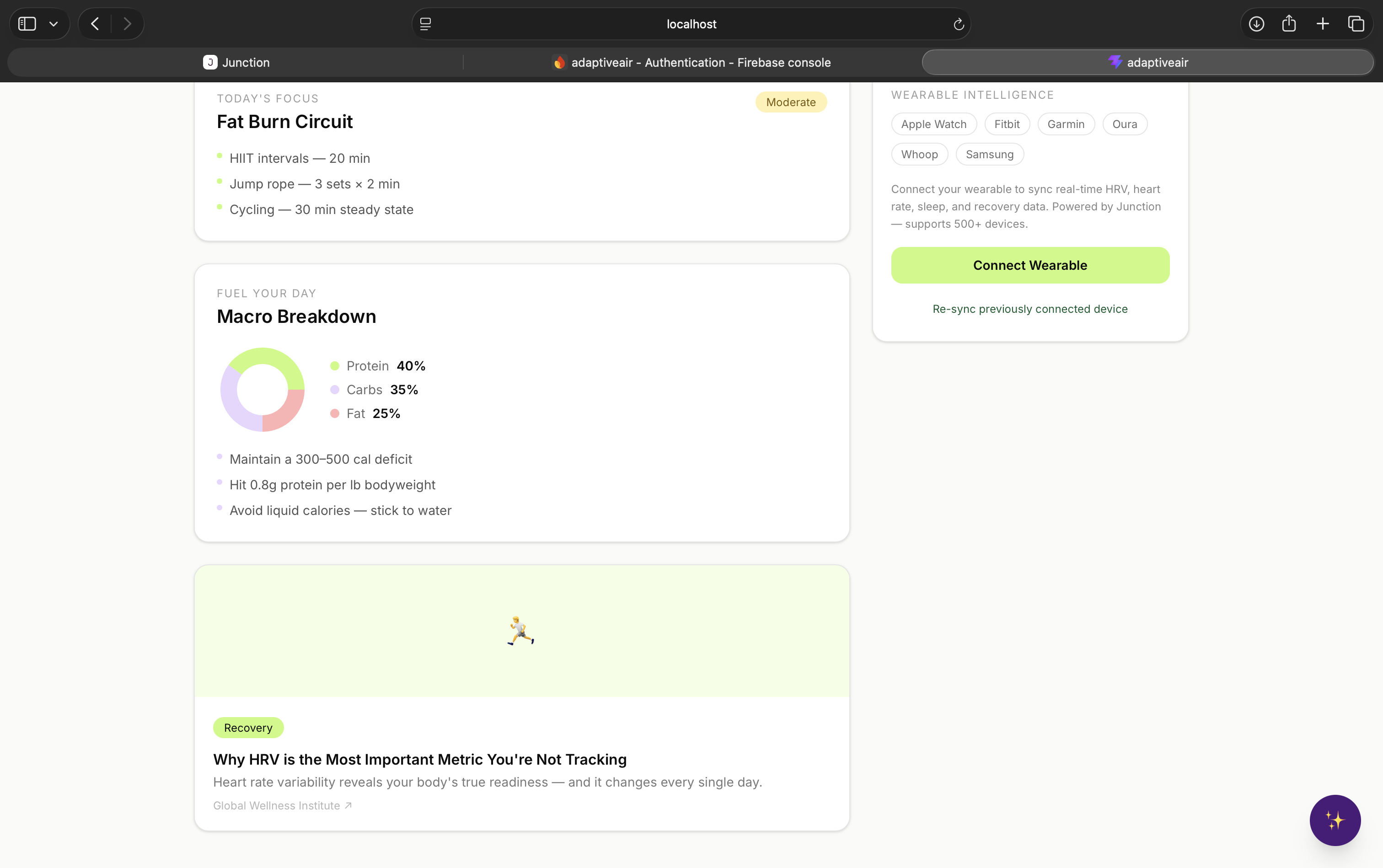 Wearable Integration: Junction/Vital unified API with OAuth widget supporting 500+ devices. Real biometric data flows through REST endpoints for sleep, activity, heart rate, and body metrics.