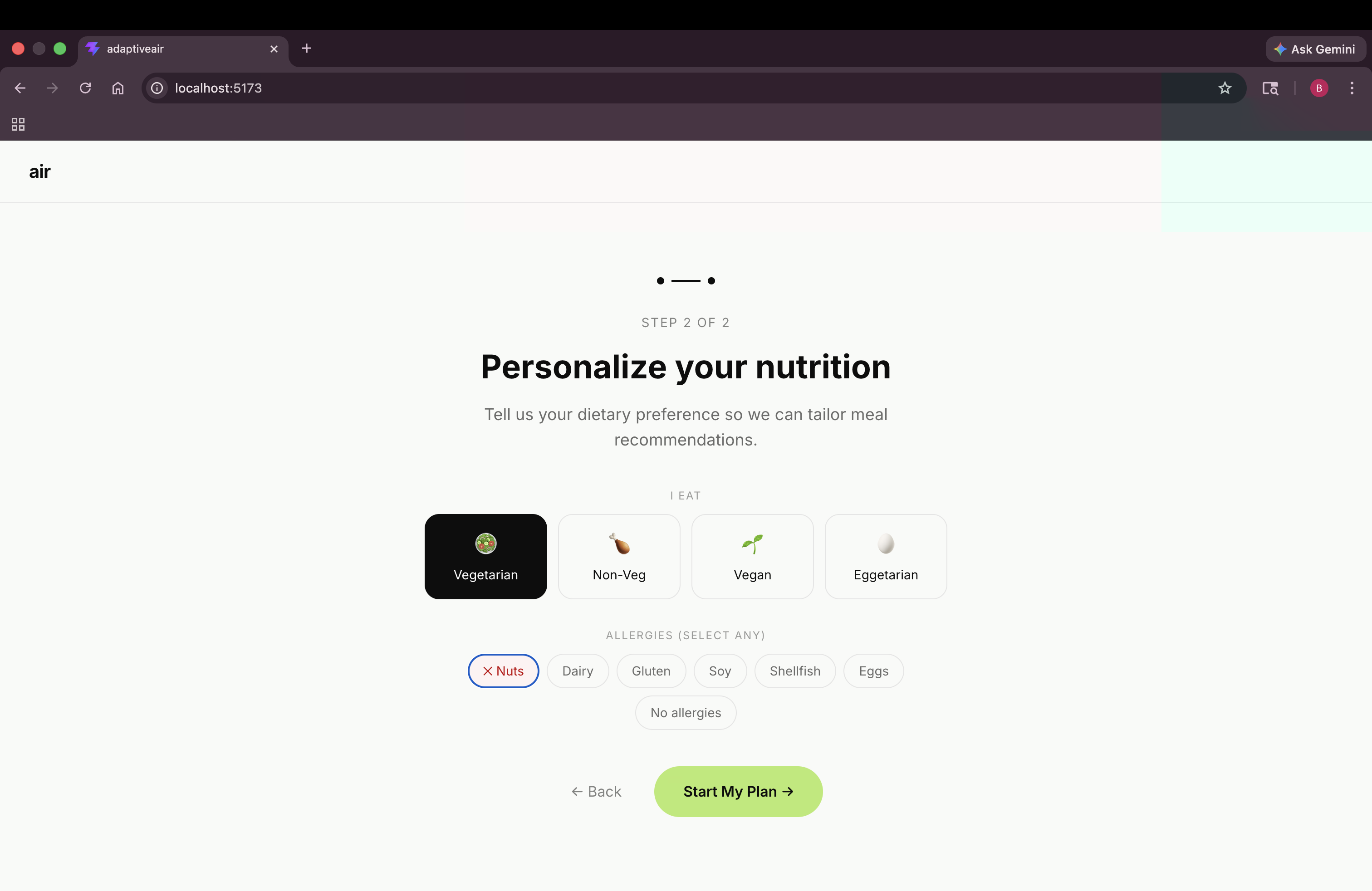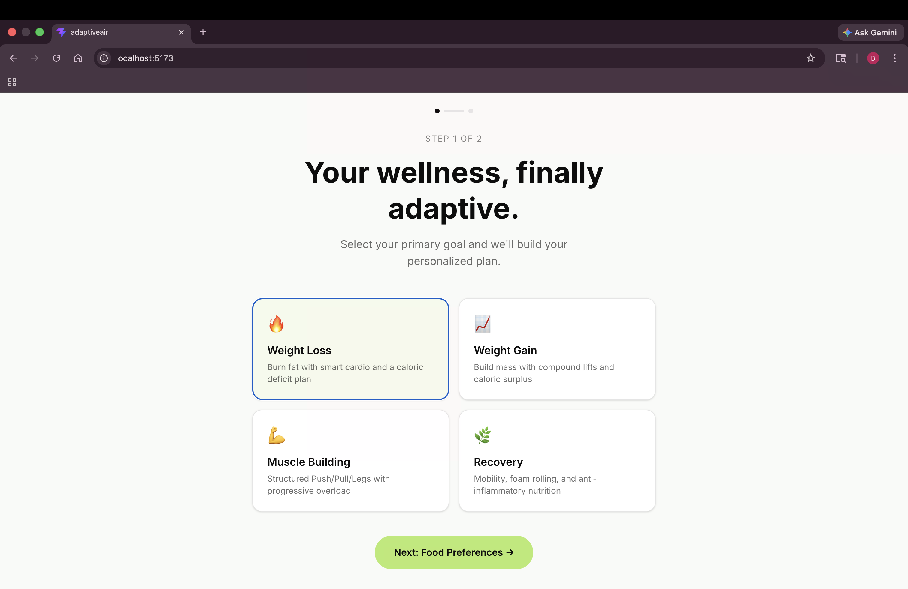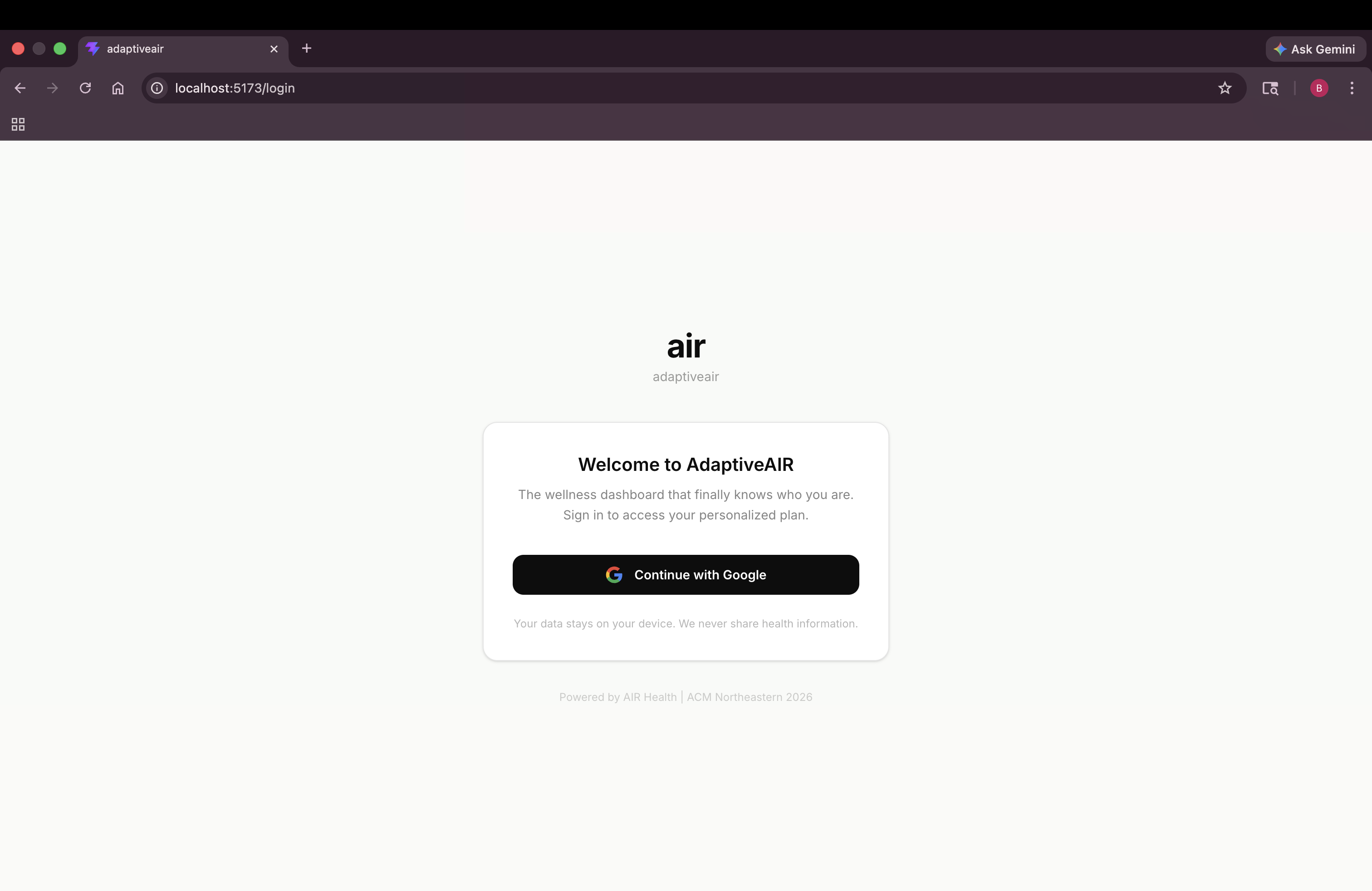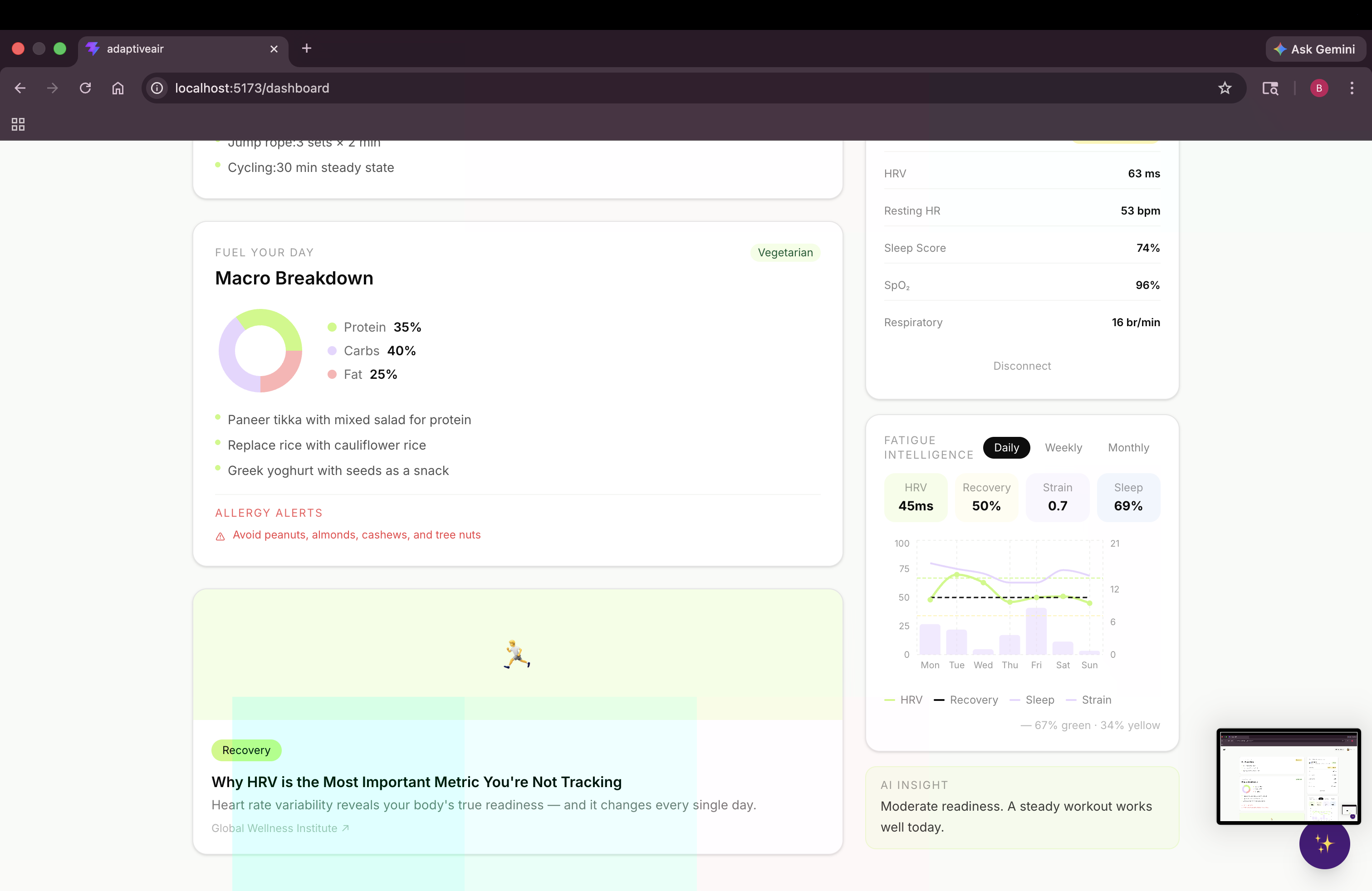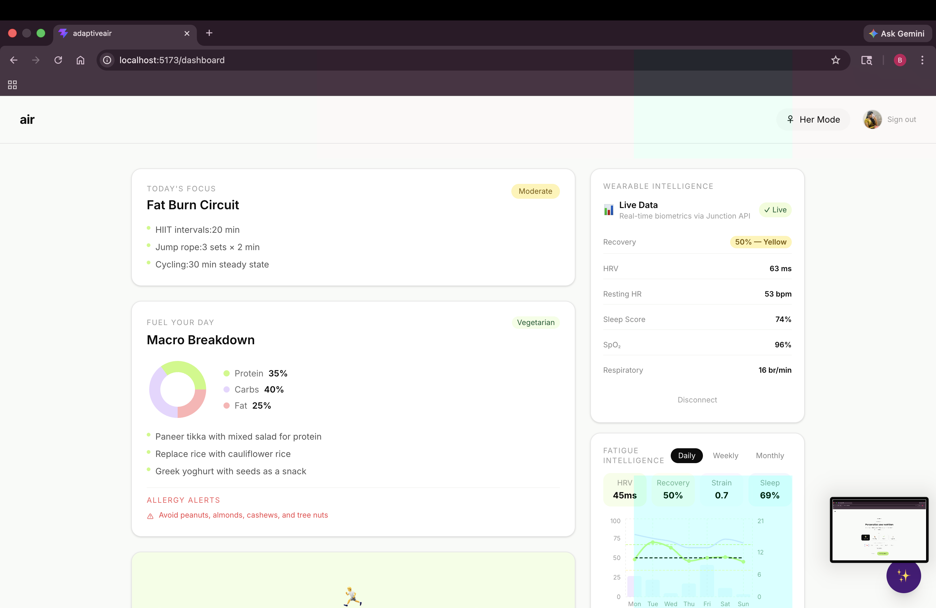 AdaptiveAIR is an AI-powered adaptive wellness dashboard with three integrated layers: