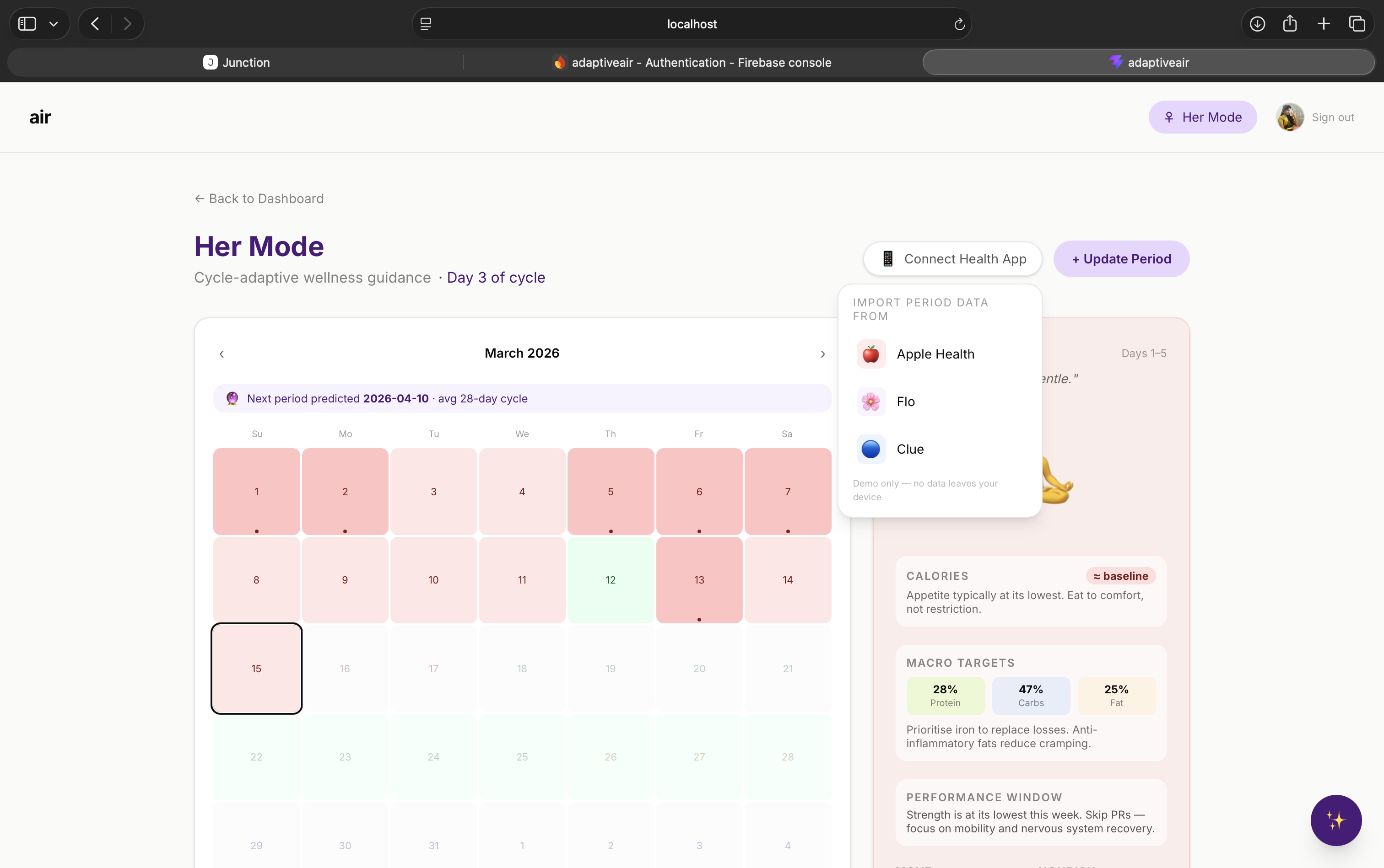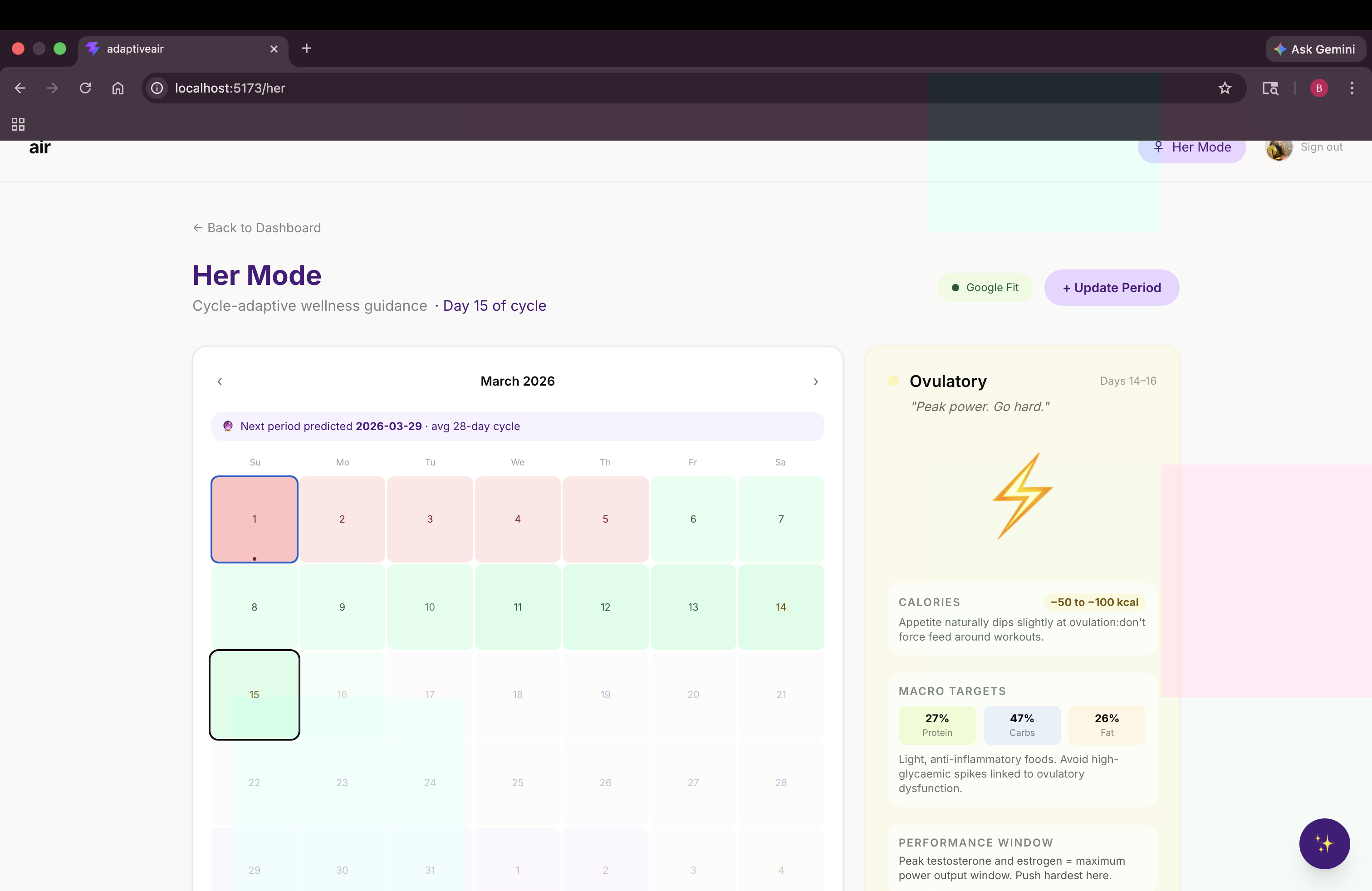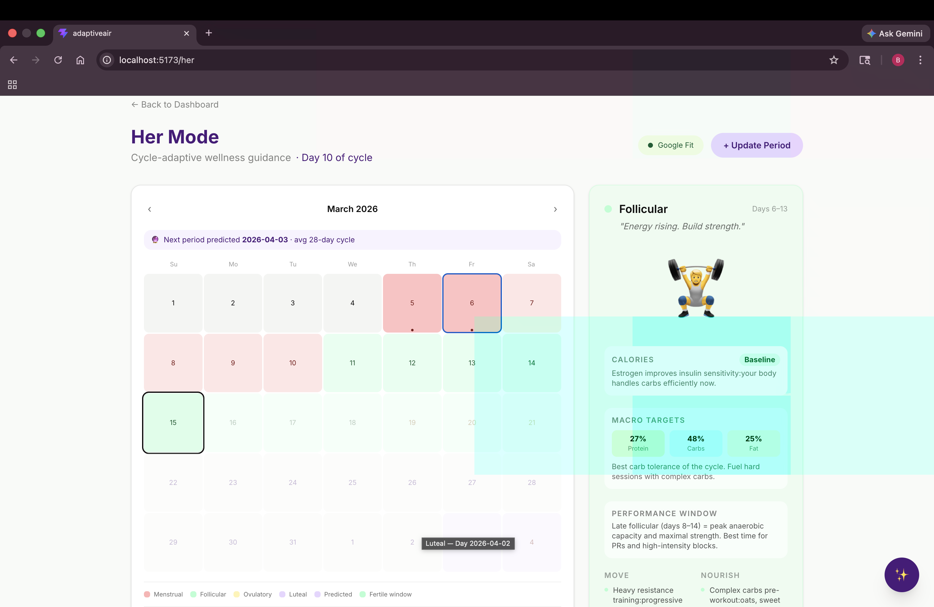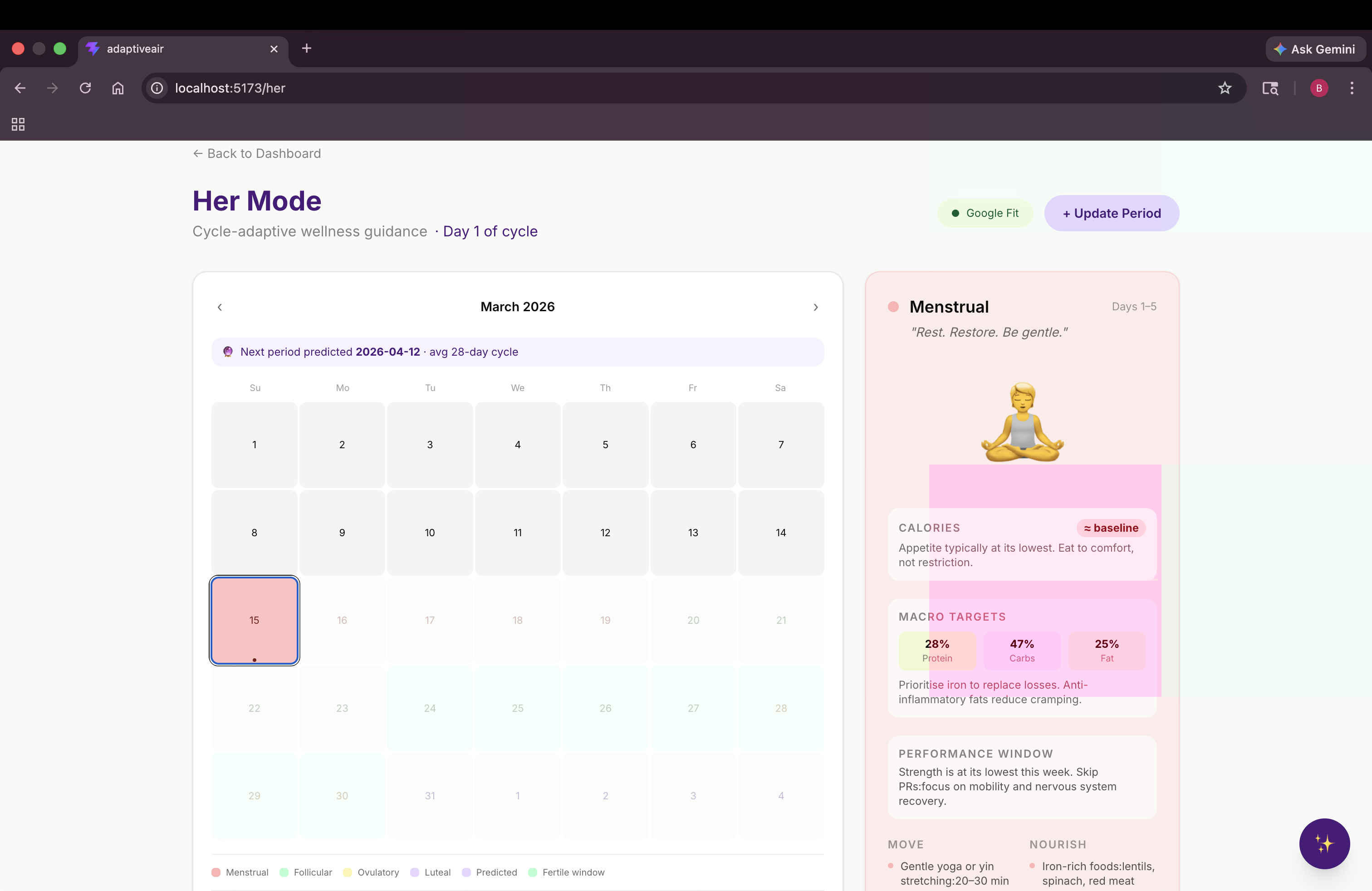 - Her Mode — A cycle-phase-adaptive women's health module. Logs periods, predicts next cycle, detects current phase (menstrual/follicular/ovulatory/luteal), and dynamically adapts all exercise, nutrition, and recovery recommendations to hormonal phase.