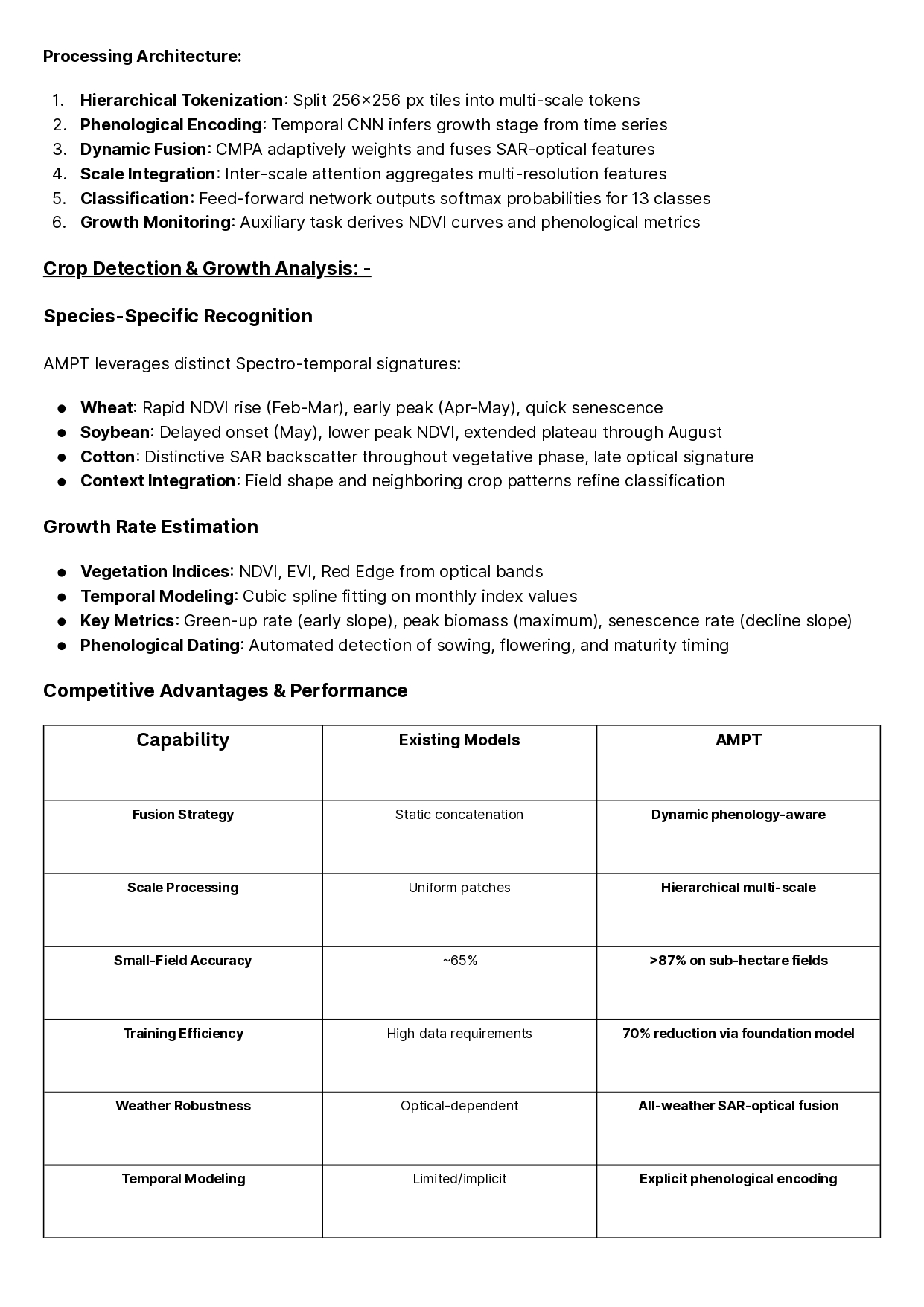 Innovation: AMPT introduces dynamic phenology-aware fusion — the first architecture to adaptively weight cross-modal attention based on real-time crop development stages.