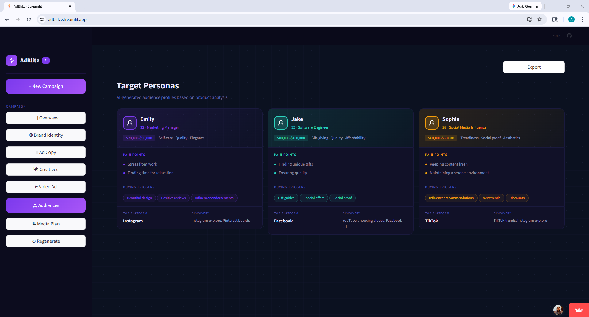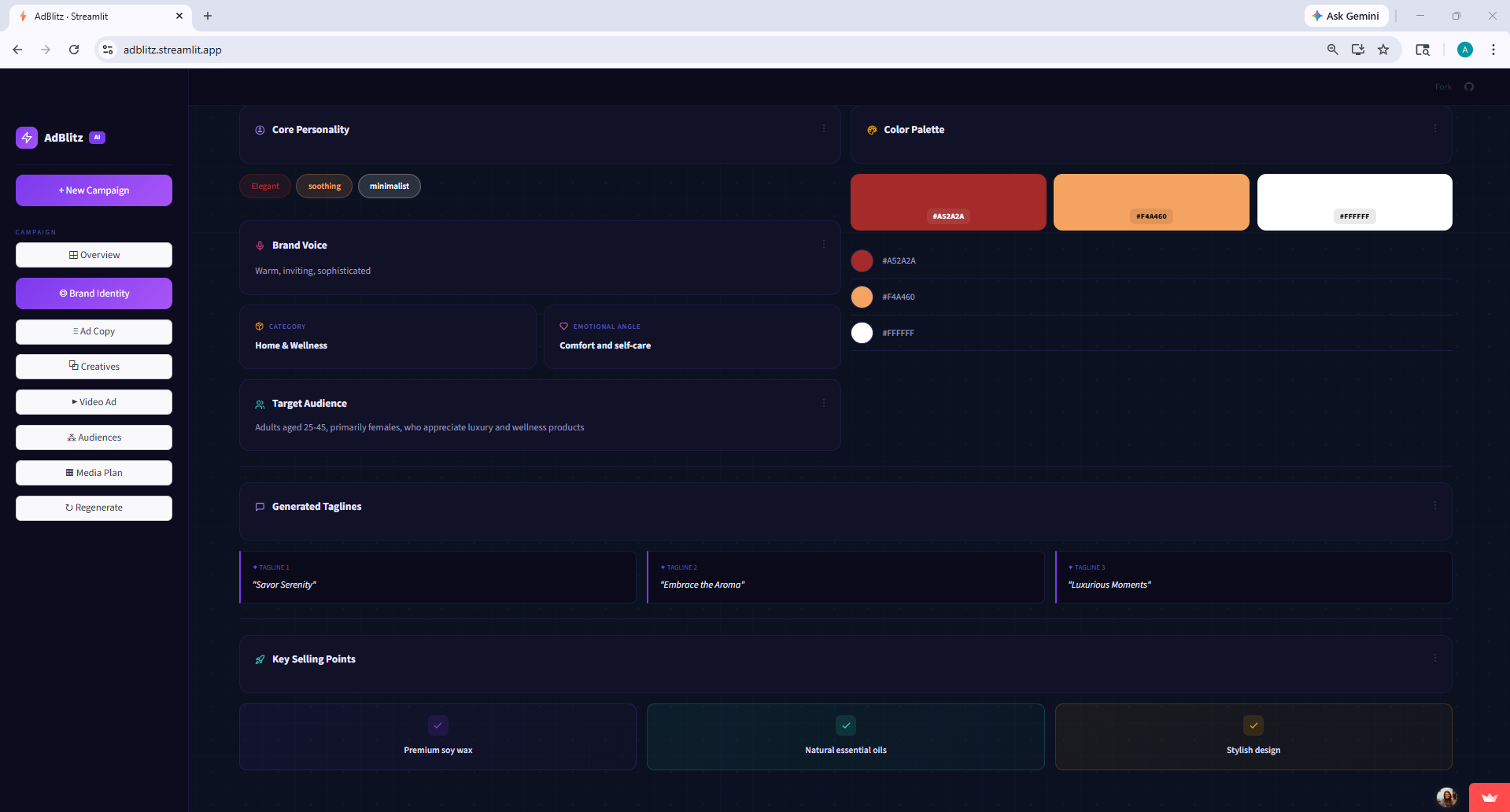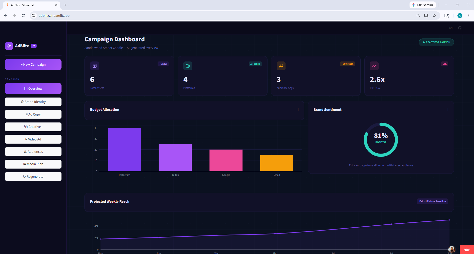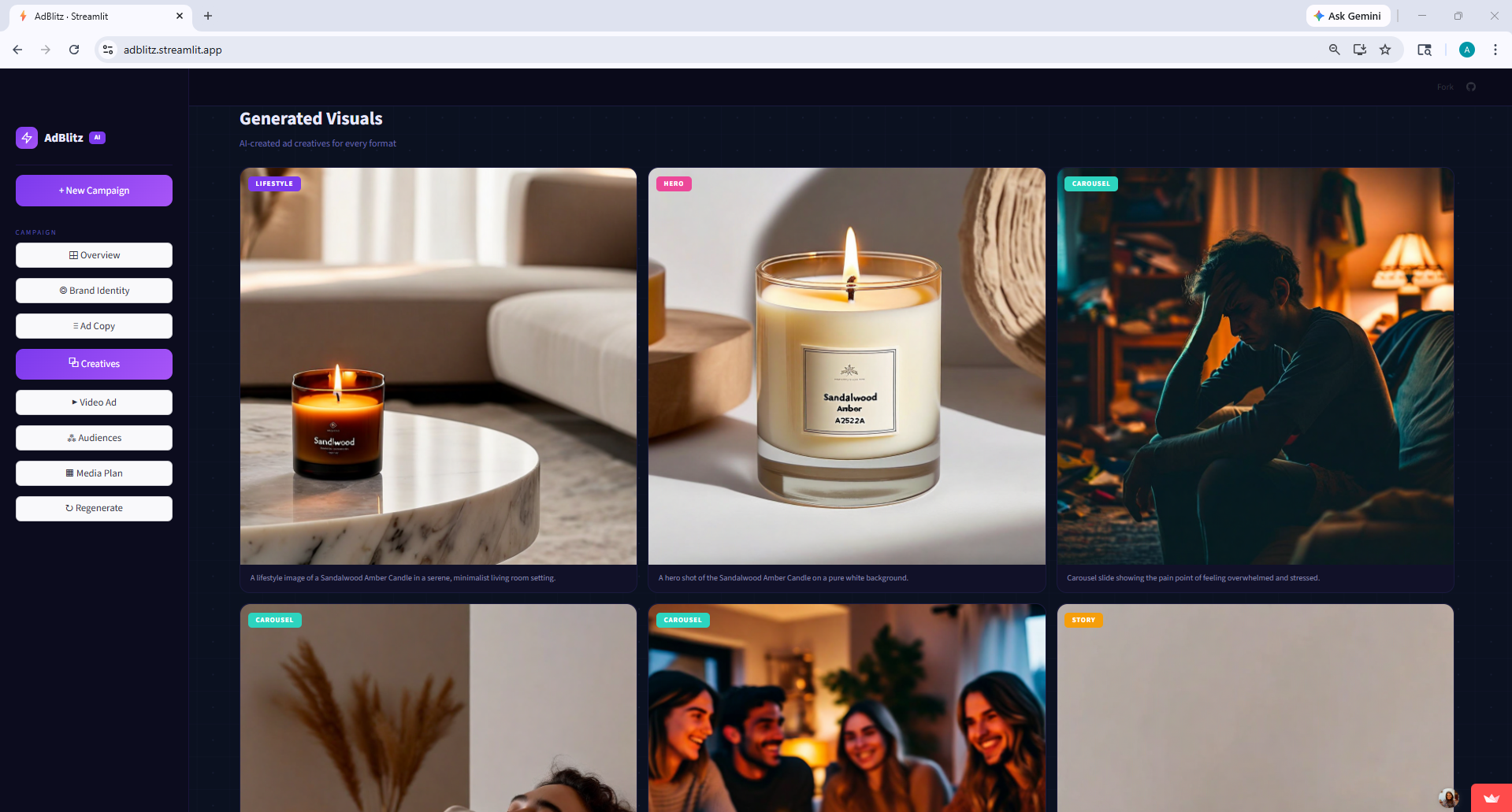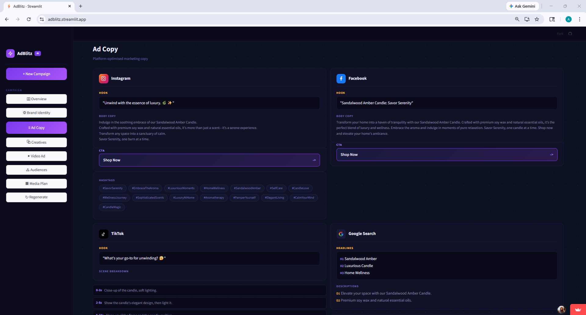 We wanted the UI to feel like a real product, not a hackathon demo with default styling. So we built a custom dark-themed dashboard in Streamlit with sidebar navigation, platform-branded icons, progress indicators during generation, and dedicated pages for each section of the campaign.