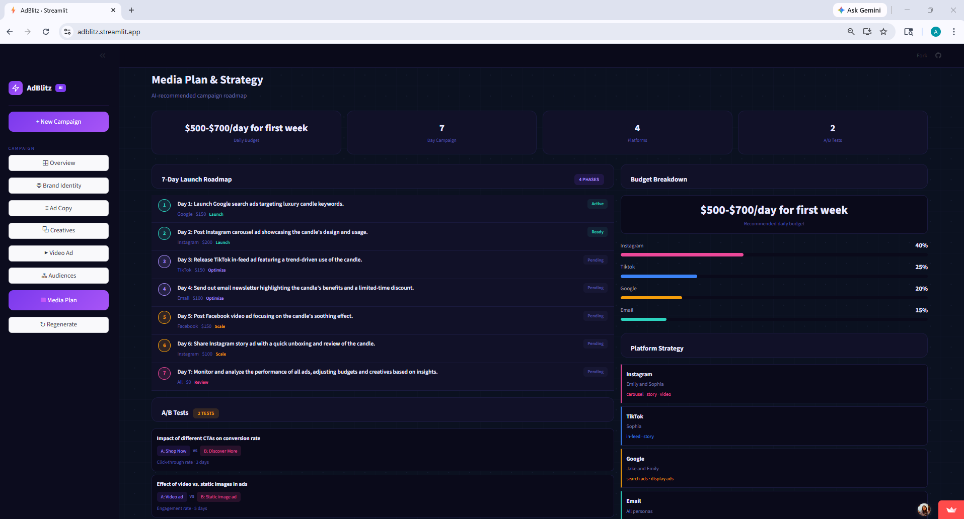 The Media Plan Agent ties everything together a 7-day launch roadmap, budget split across platforms, targeting strategies for each persona, and A/B test recommendations.