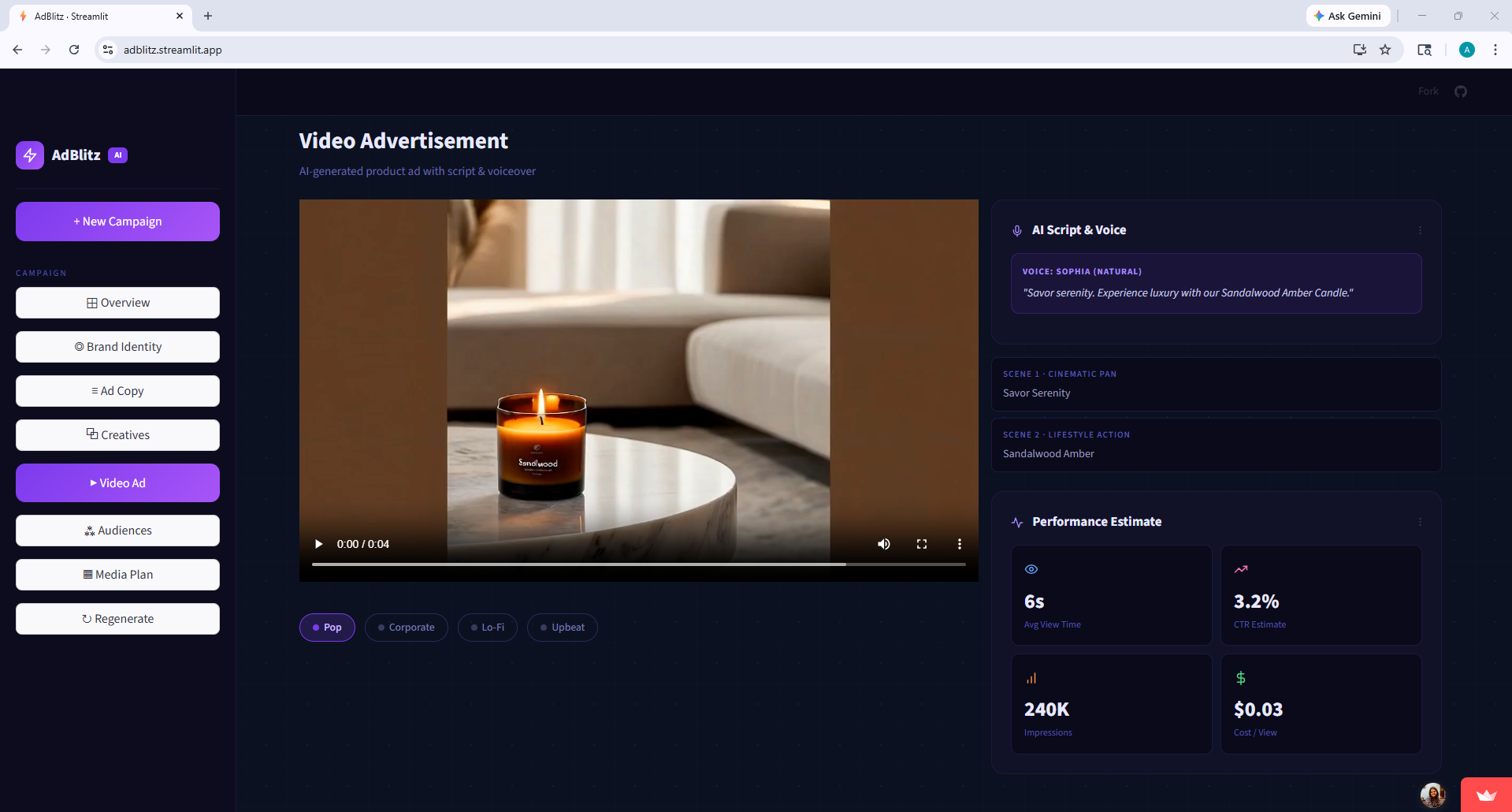 - Longer, richer video ads : right now we generate 6-second clips. With more compute time and higher-tier model access, we want to support 15, 30, and 60-second video ads with multi-scene transitions, background music, and dynamic text overlays.