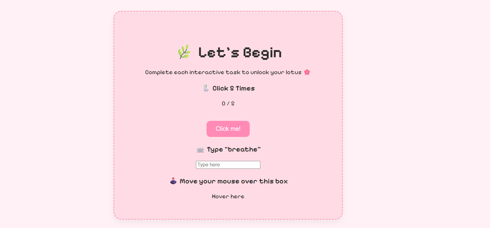 - Game Elements: Vanilla JS click/keyboard-based mini-games (e.g. simple exercises)