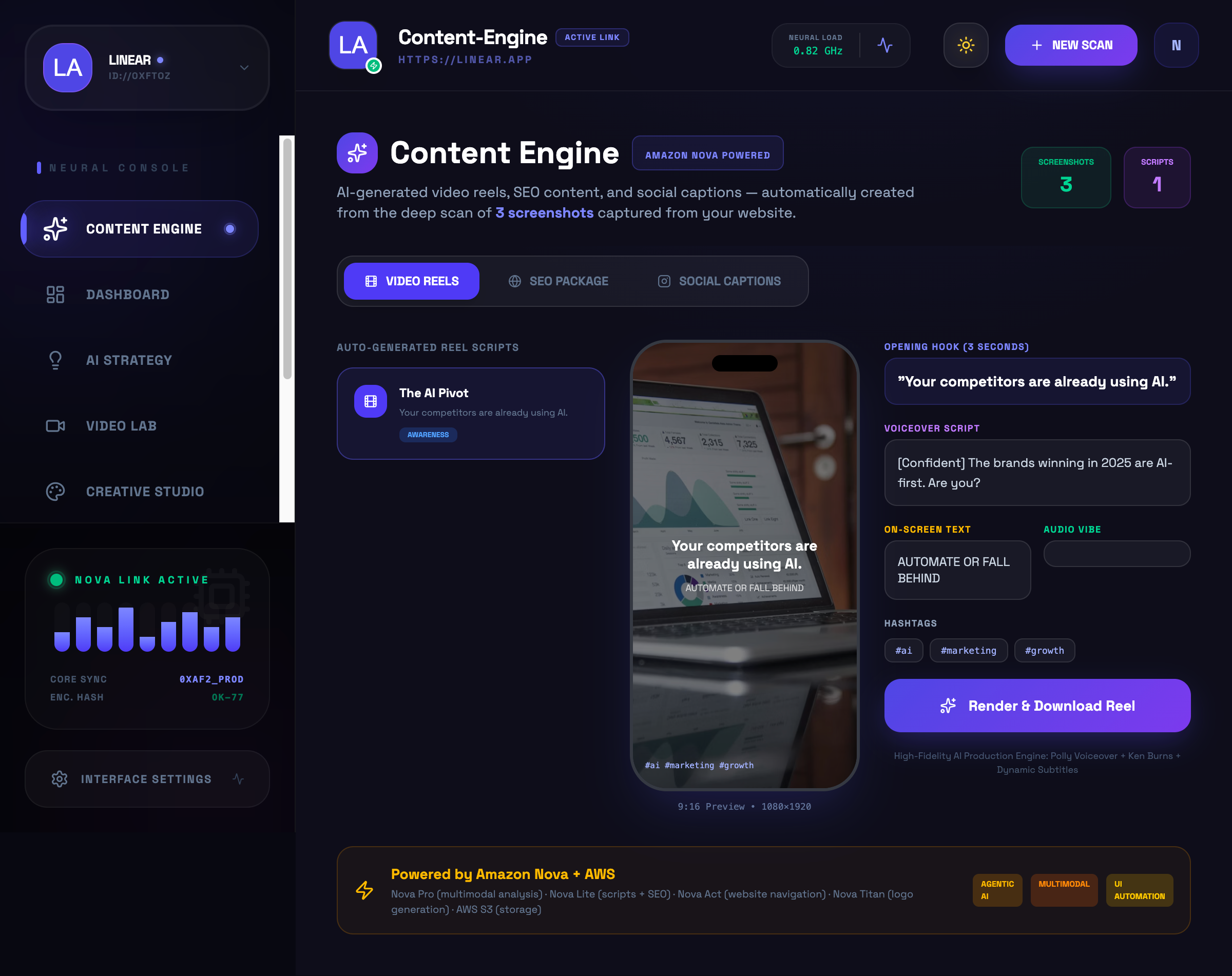 💡 Inspiration Marketing for small businesses and startups is often a massive bottleneck. We wanted to build an "Autonomous Creative Director" that doesn't just suggest ideas but actually sees a brand, thinks about the strategy, and acts by producing high-fidelity video content and SEO clusters without human intervention. The launch of Amazon Nova provided the perfect multimodal stack to turn this vision into reality—allowing us to move from static tools to a living "Creative Core."