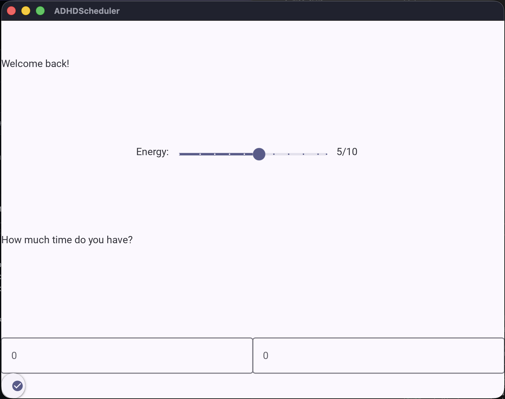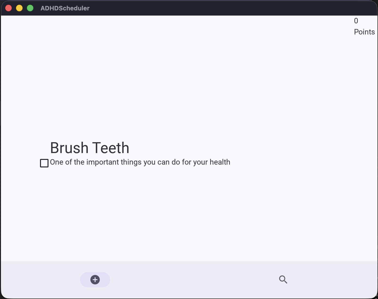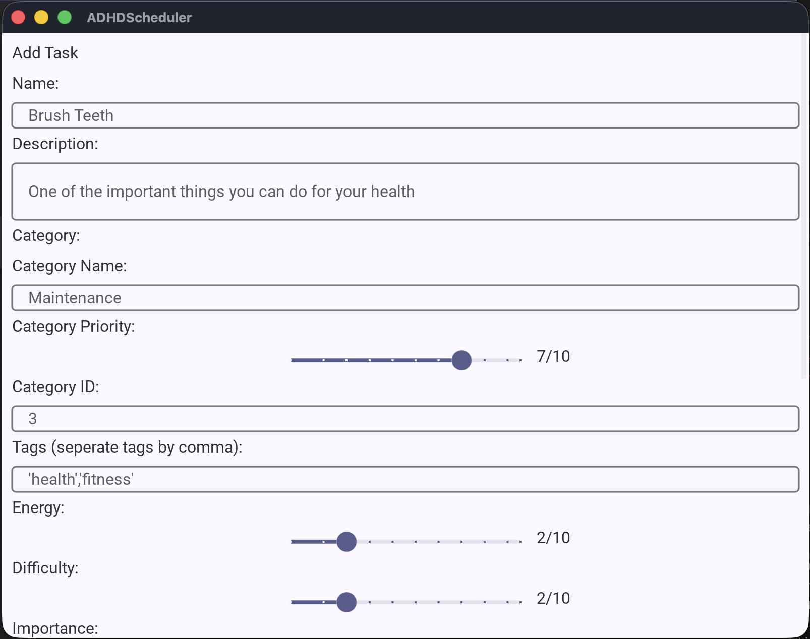 The ADHDScheduler is a task manager program that operates in a unique way compared to other schedule builders. First, the user adds an assortment of tasks to the program, ranking them by importance, category, energy required to complete, etc. And then, the program selects a task for the user to complete based on calculated priority and the user's current energy level, offering up points as an incentive and discouraging burnout with energy-related logic. These points can potentially be used for various things, like new backgrounds, bonus tasks, etc. (The bonus tasks are the tasks given to the program as an incentive to complete some of the more menial tasks).
