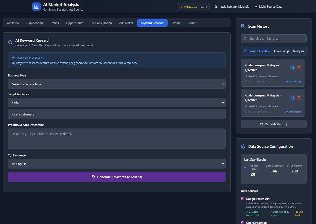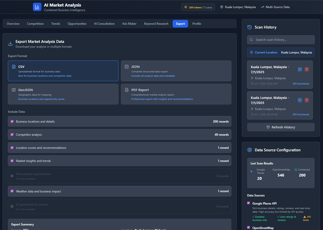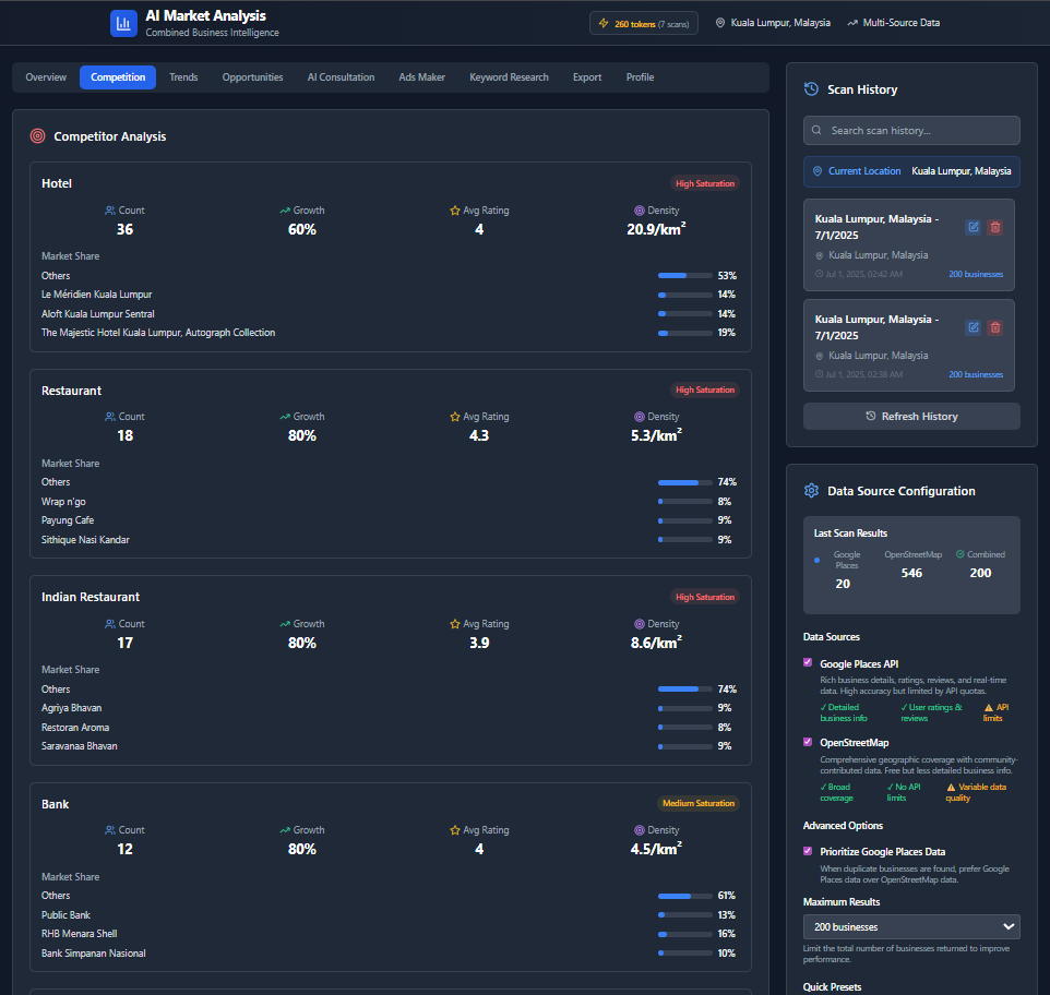 Pulls live data from Google Places and OpenStreetMap to assess business density, competitors, and potential in any area.🧠 AI Marketing Consultant