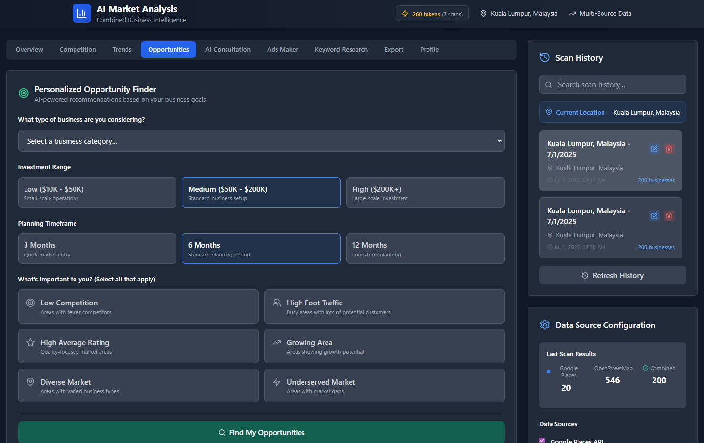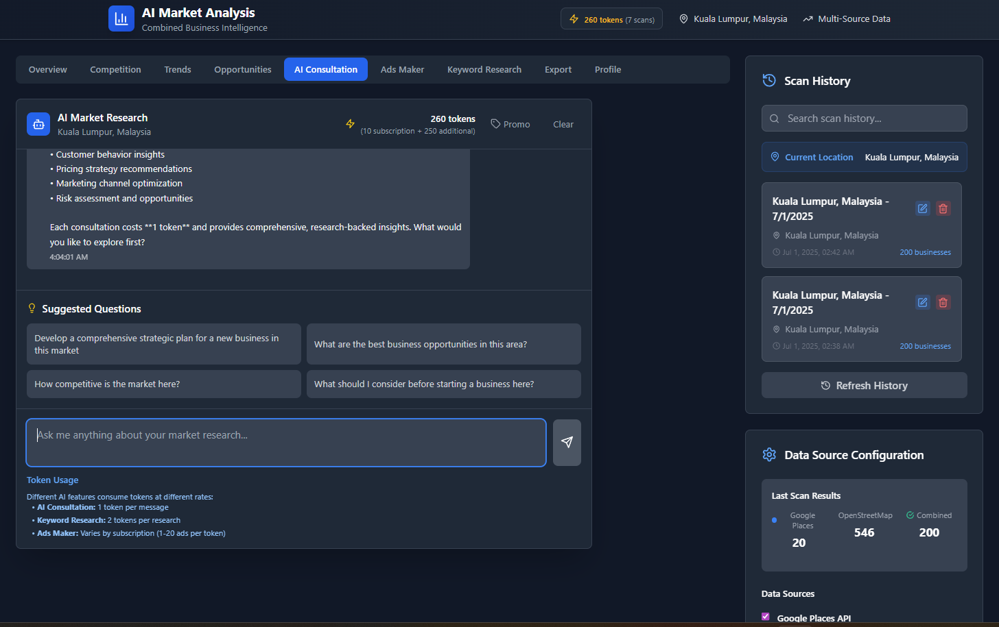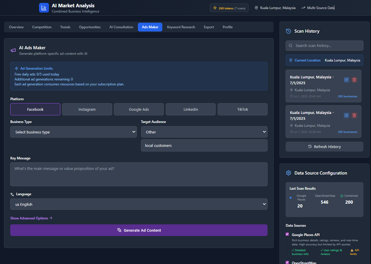 Pulls live data from Google Places and OpenStreetMap to assess business density, competitors, and potential in any area.🧠 AI Marketing Consultant