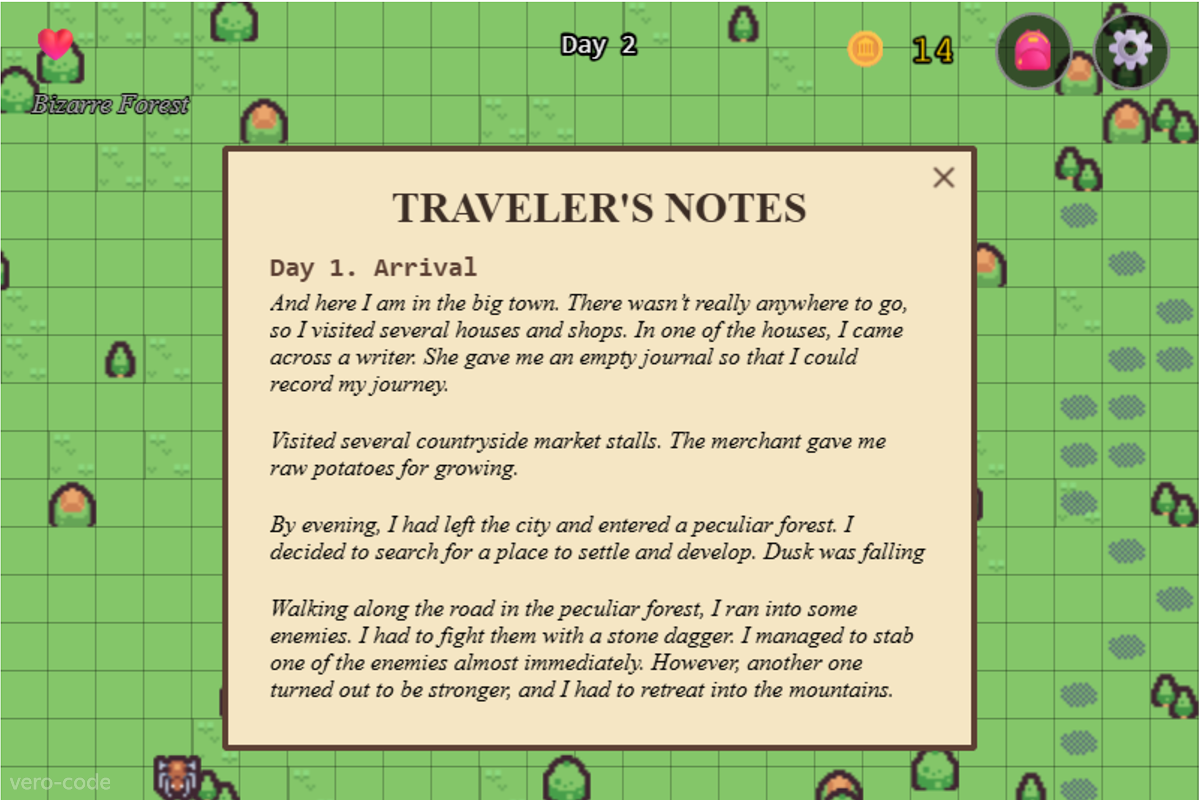 - Objective: Survive the procedural forest by managing your hearts (eat Potatoes to heal). Reach the cliff edge to trigger the story transition to Day 2.