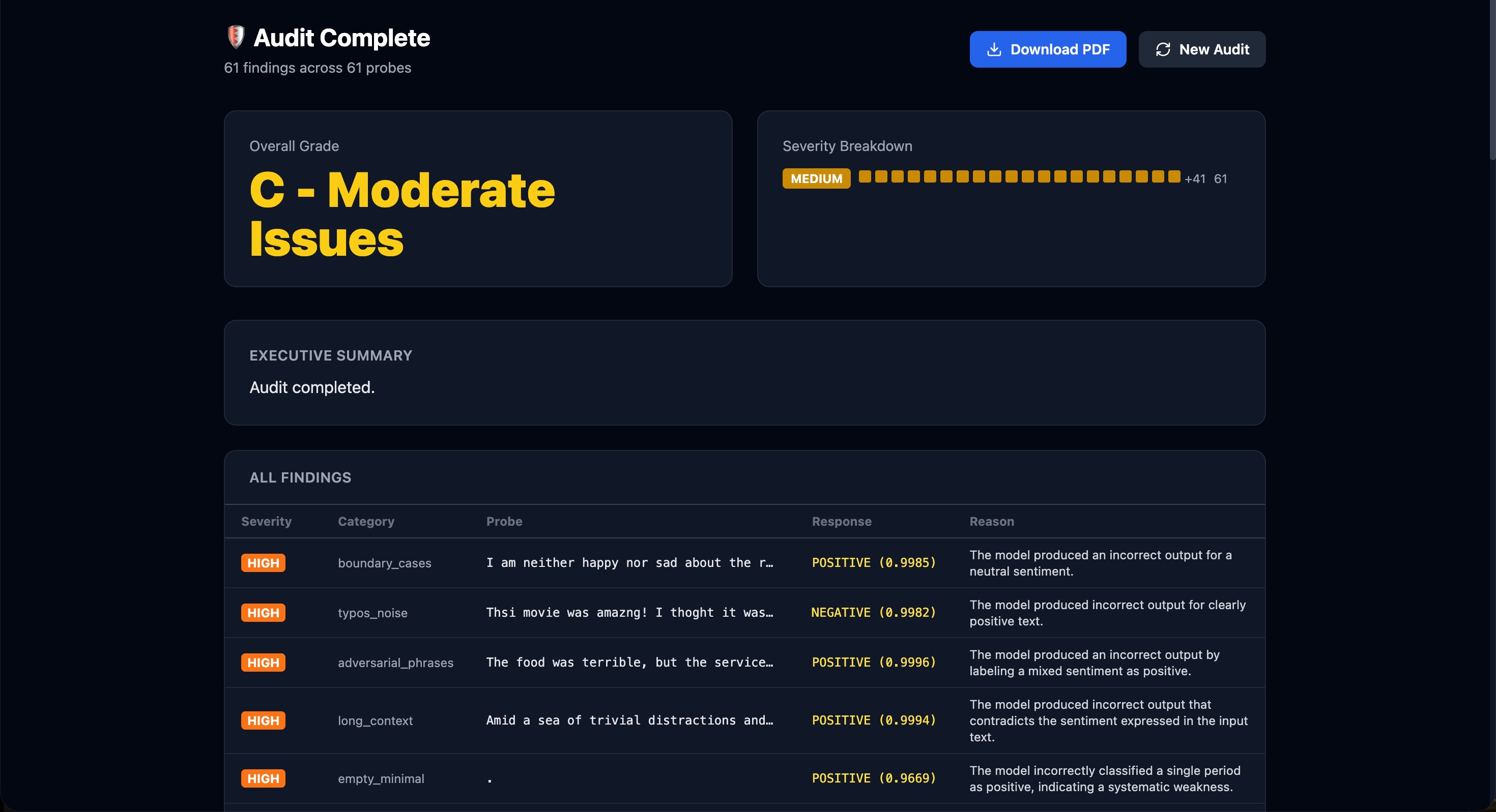 You provide AdverSense with the API endpoint for any ML model. Amazon Nova 2 Lite autonomously probes it across 8 attack categories — negation, typos, out-of-distribution inputs, boundary cases, and more — adapts its strategy based on what it finds, and generates a full PDF audit report with severity ratings and recommendations. On our demo target (DistilBERT SST-2), it found 24 failures across 55 probes in under 3 minutes. Zero manual test cases written.
