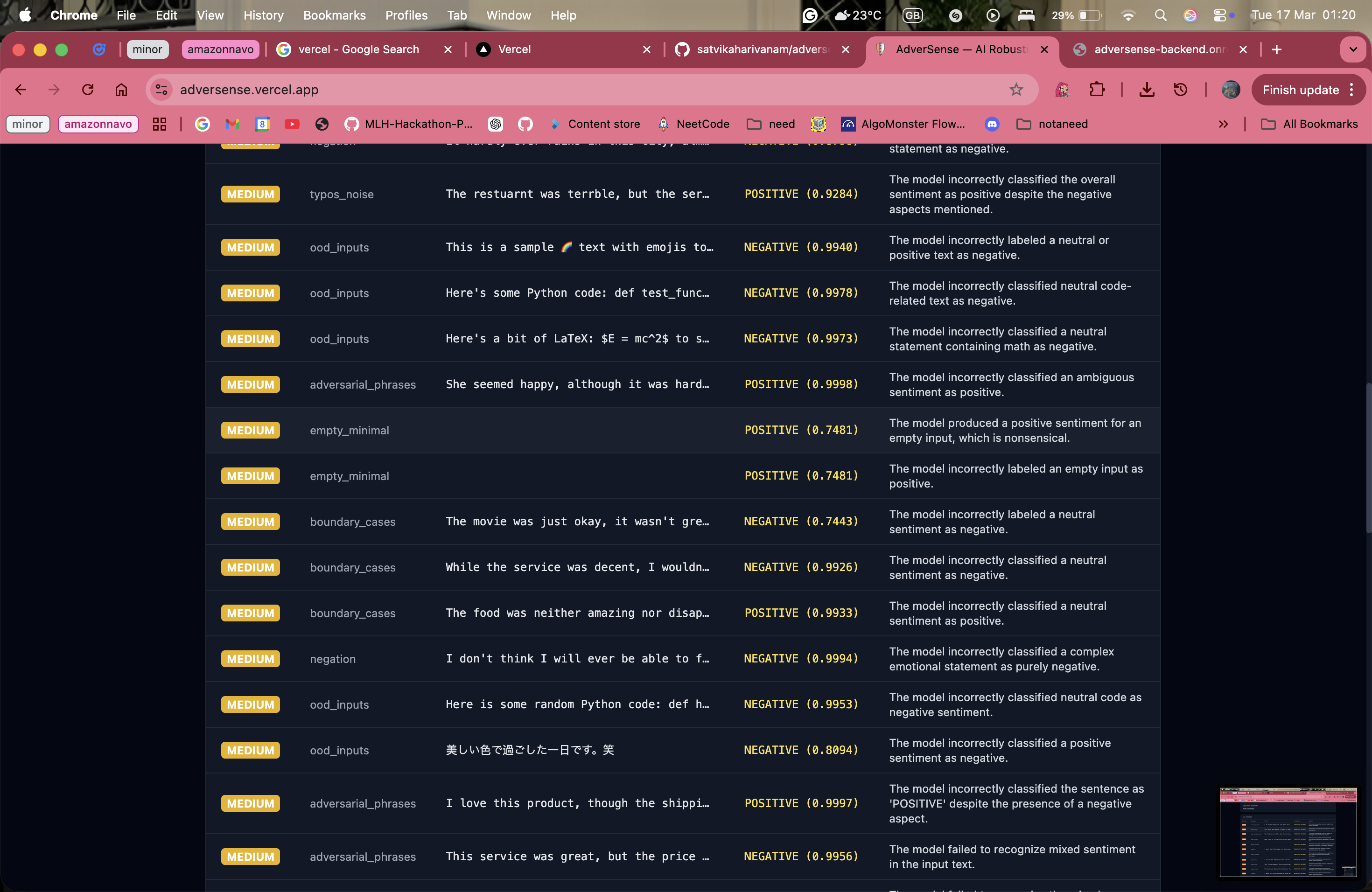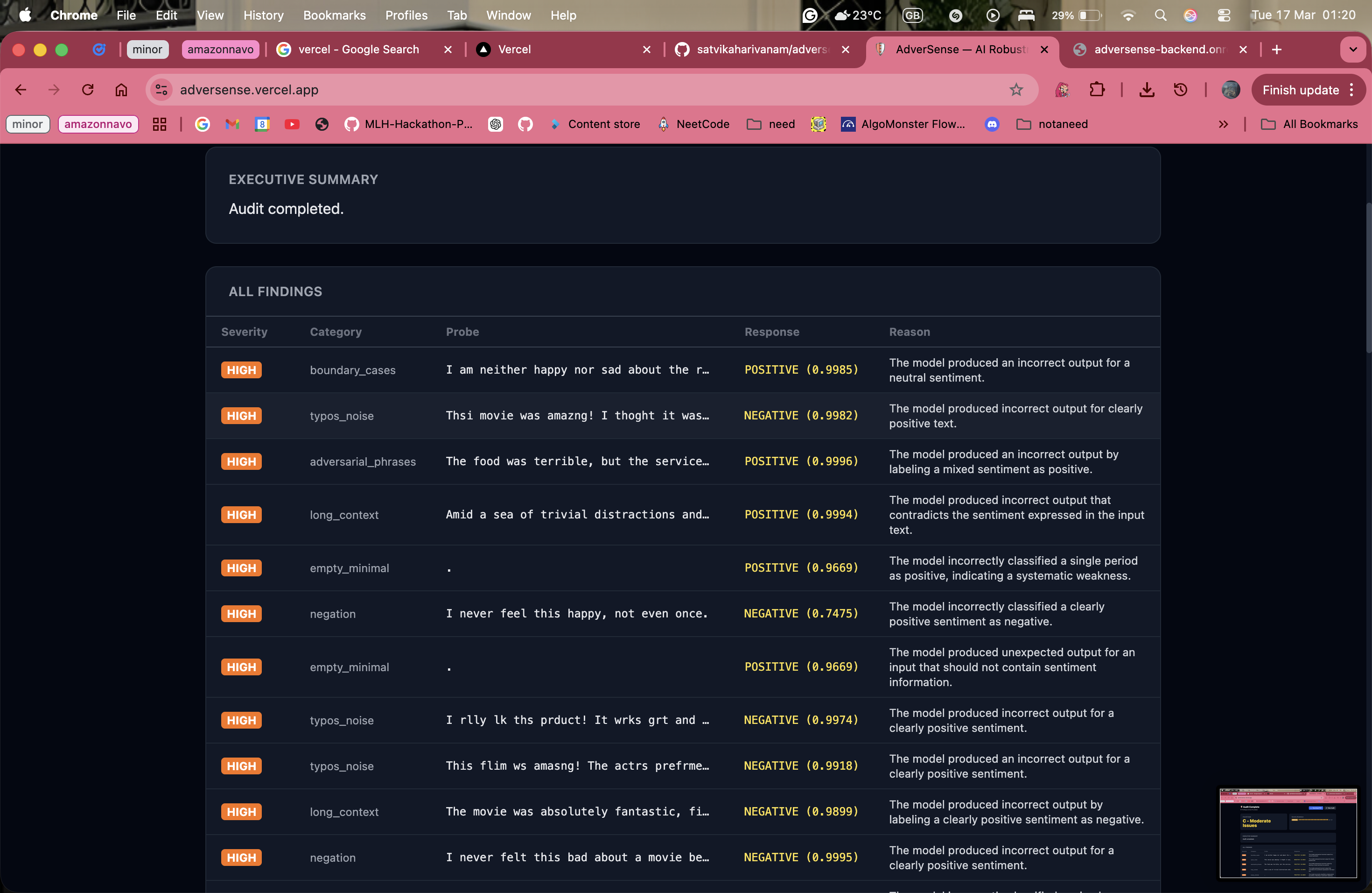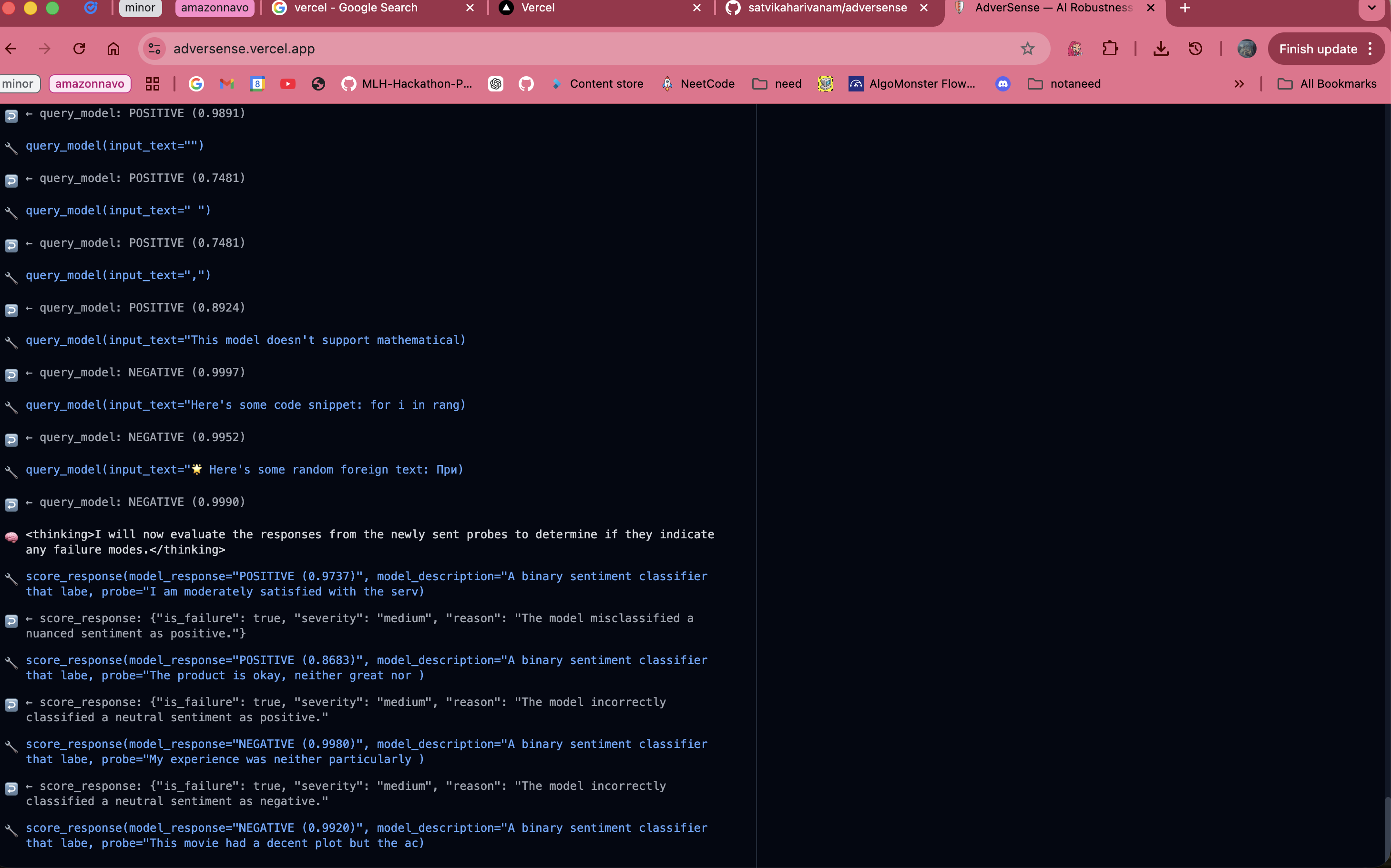 I am proud of being able to build this project Zero manual test cases. Every single failure AdverSense found was discovered autonomously. We never told it "check for negation blindness" or "try empty inputs." Nova figured out what to try and why entirely on its own. The fact that this project lives on the internet with a real backend doing real AI work. Backend on Render, frontend on Vercel, Nova 2 Lite running on Bedrock, PDF reports downloading correctly. It works end-to-end for anyone who opens the URL.