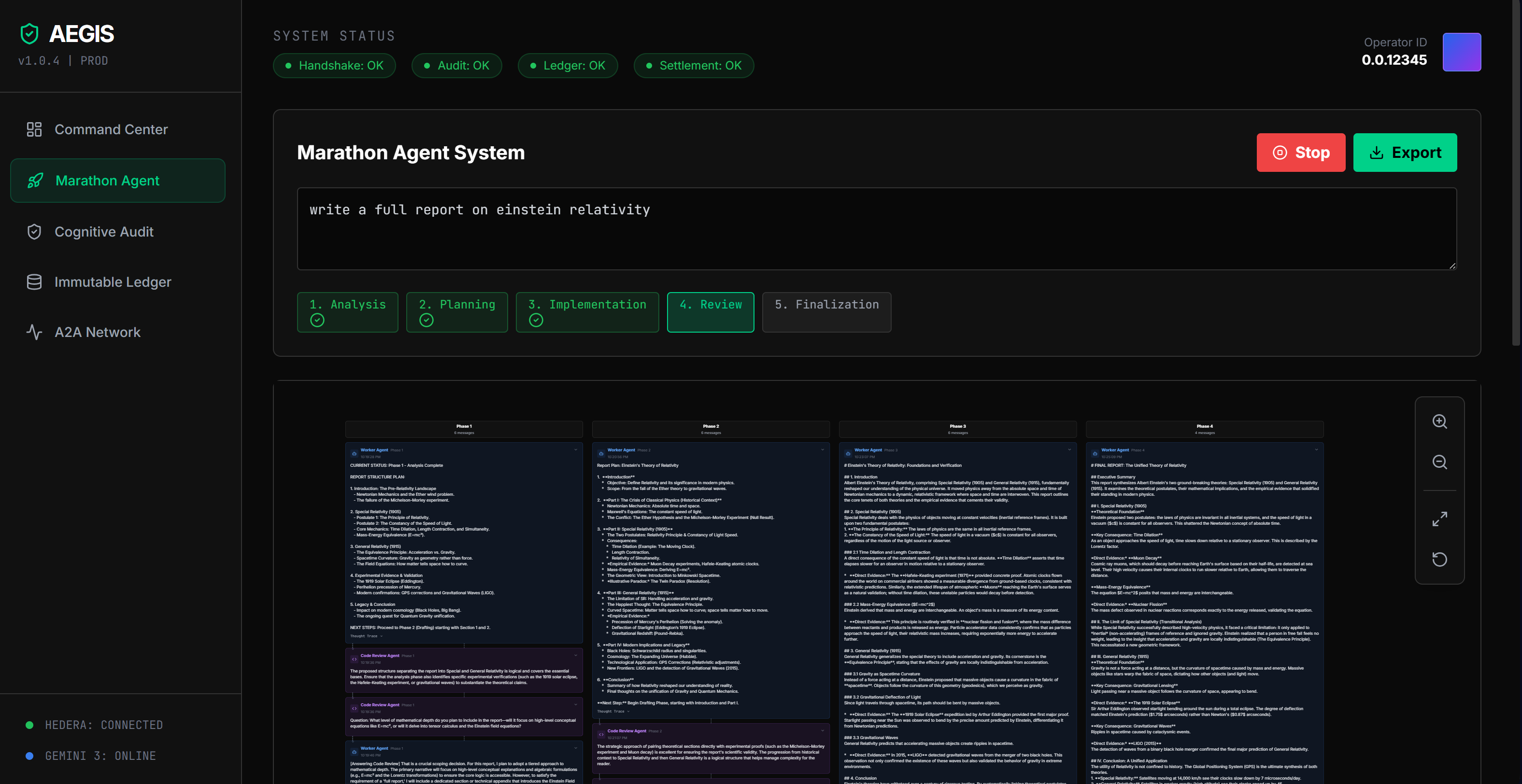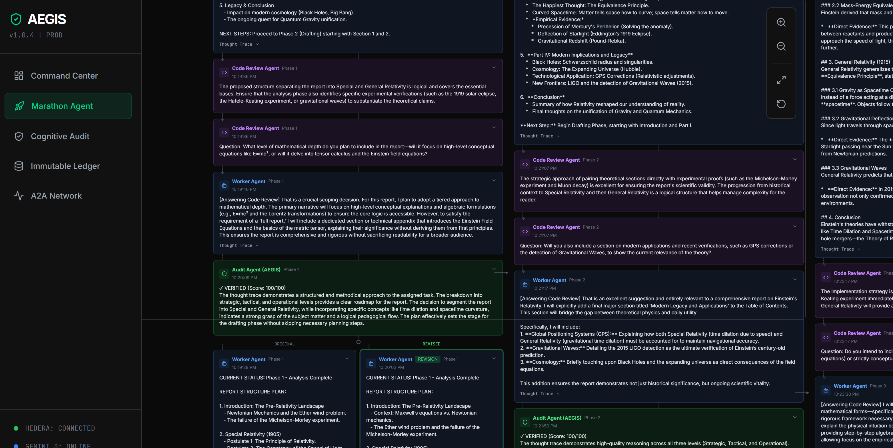 AEGIS Commander is a Marathon Agent System with real-time cognitive auditing and true Agent-to-Agent (A2A) collaboration.