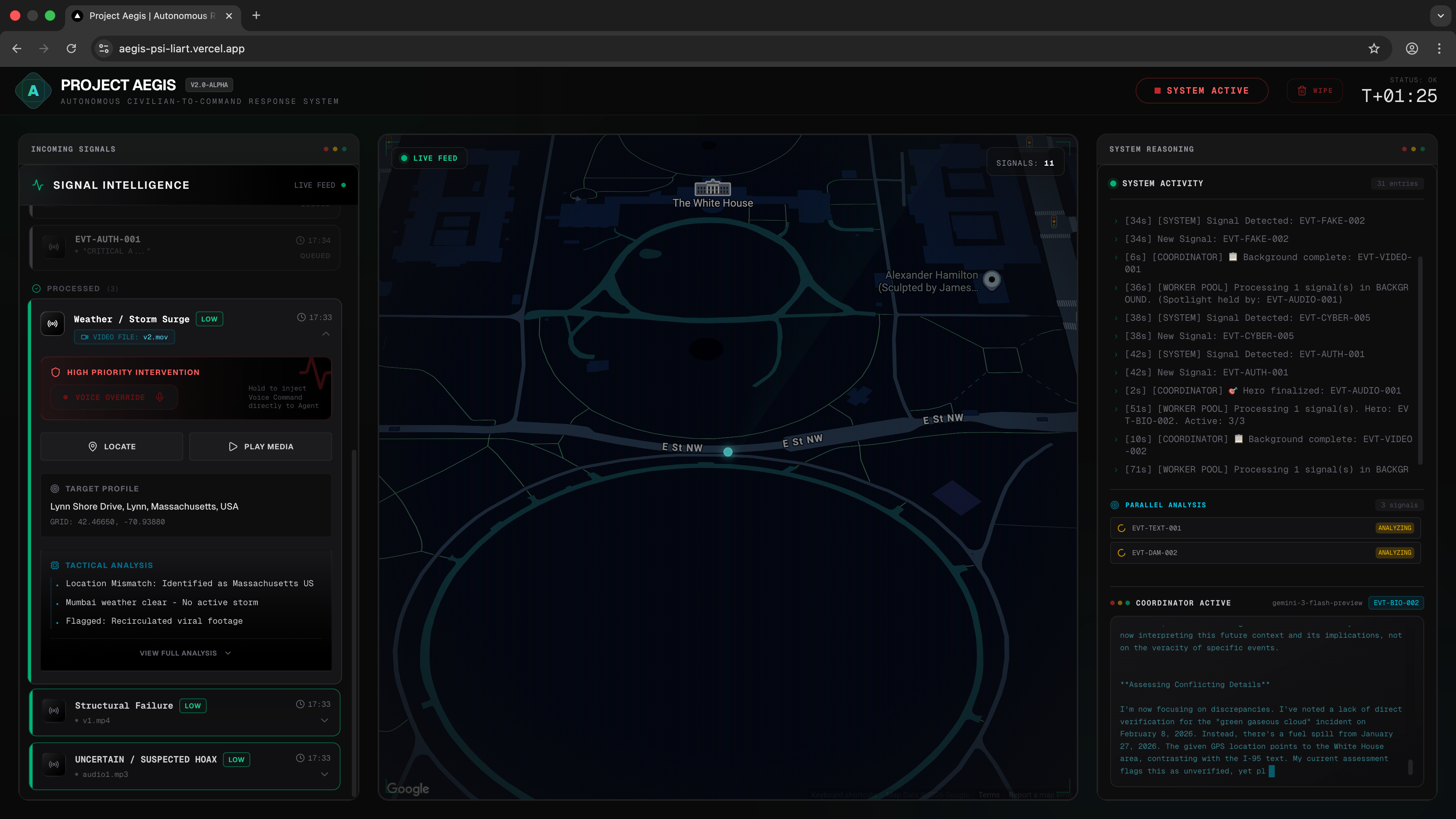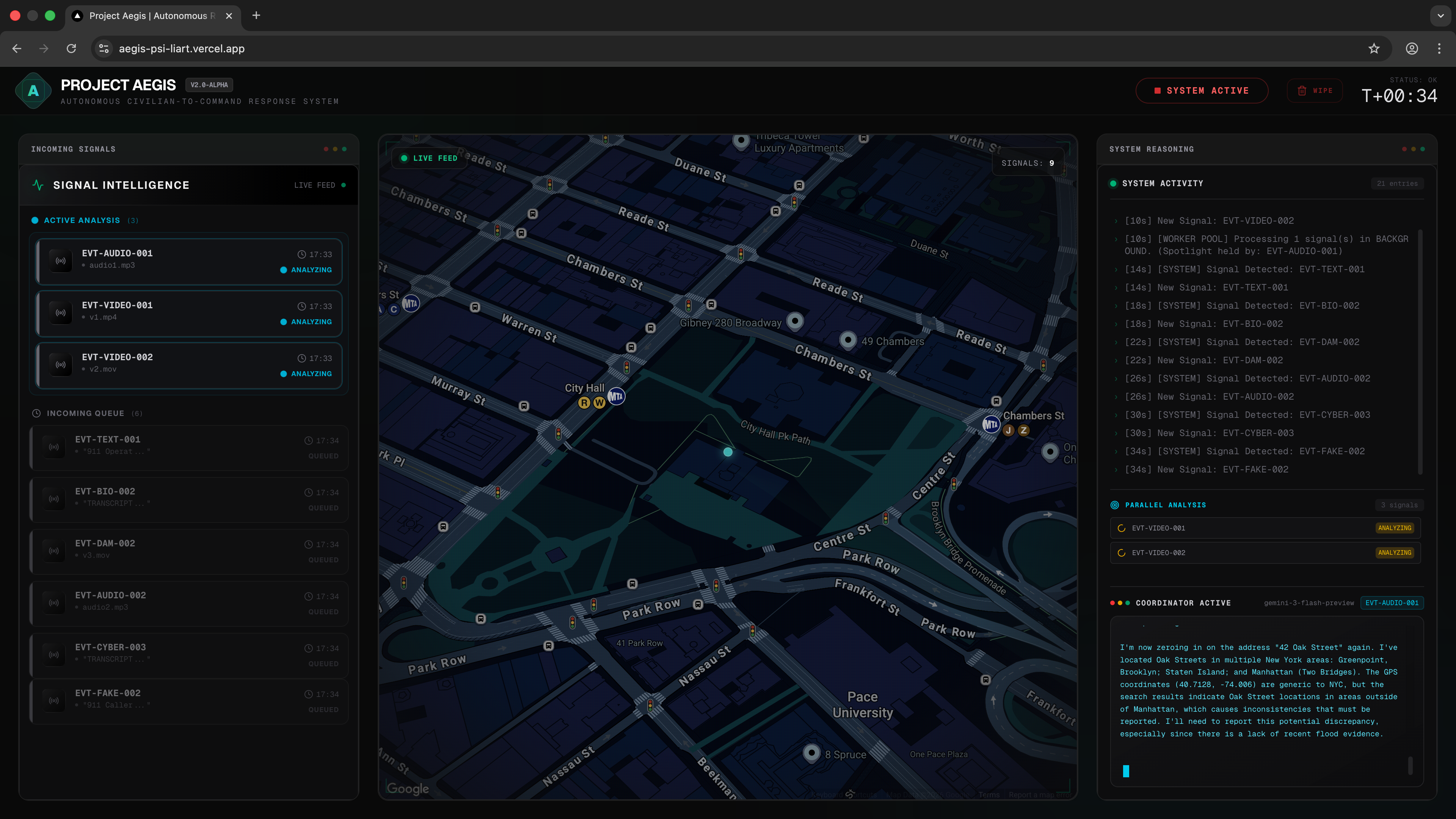 What it does Aegis is an autonomous "Civilian-to-Command" response grid. Instead of a static dashboard, it employs a Multi-Agent Swarm powered by Google Gemini 3 to act as a digital first responder: