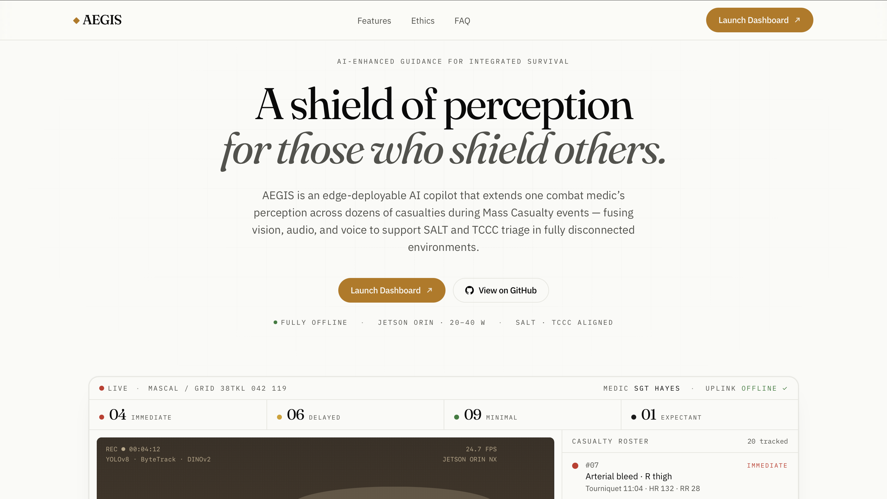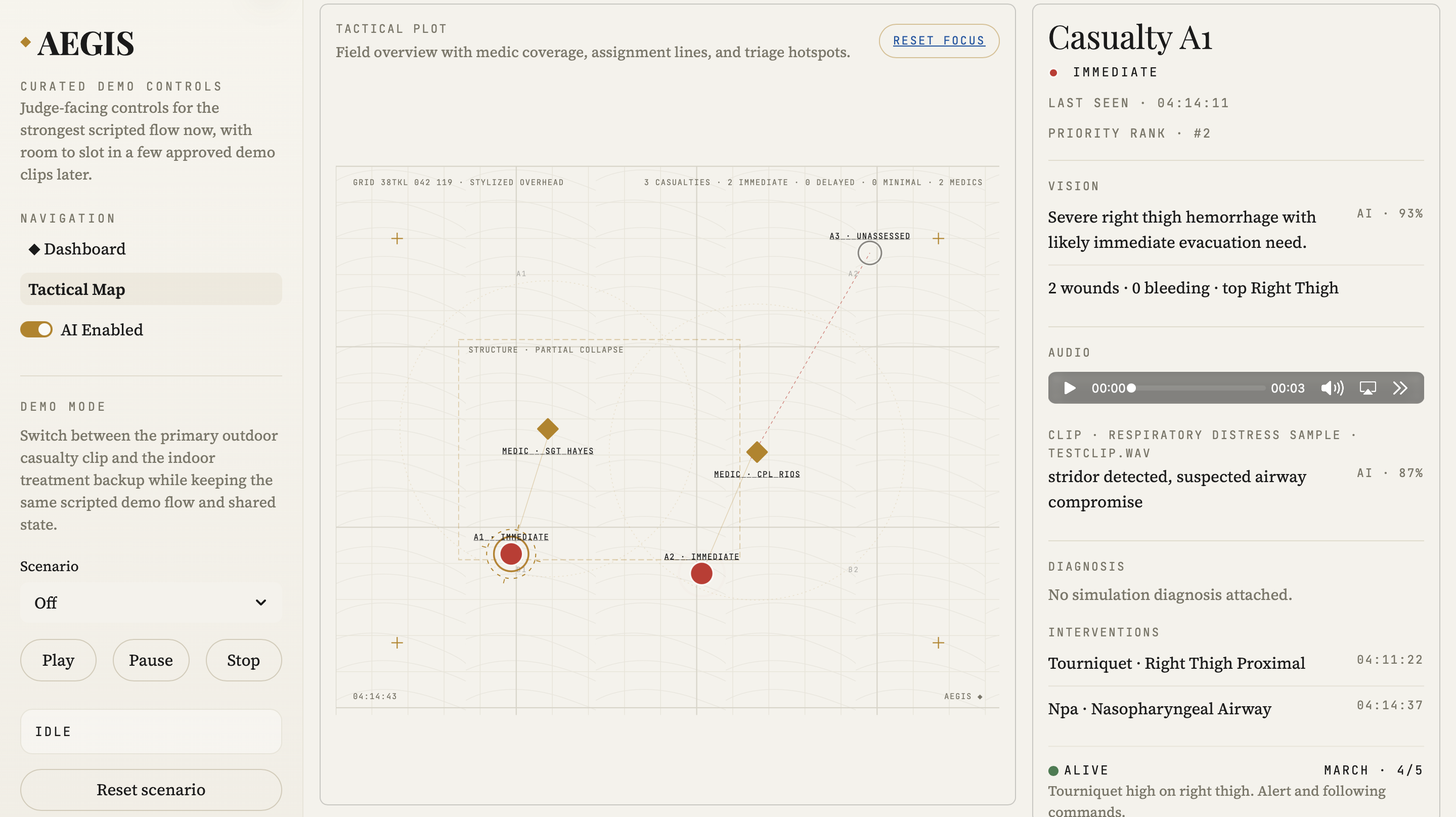 Aegis is a multi-modal triage support system that combines audio and visual inputs to assist with casualty prioritization. Users can click on individuals in a map-based UI to access respiratory analysis and visual cues, which are fused into a triage recommendation with reasoning.