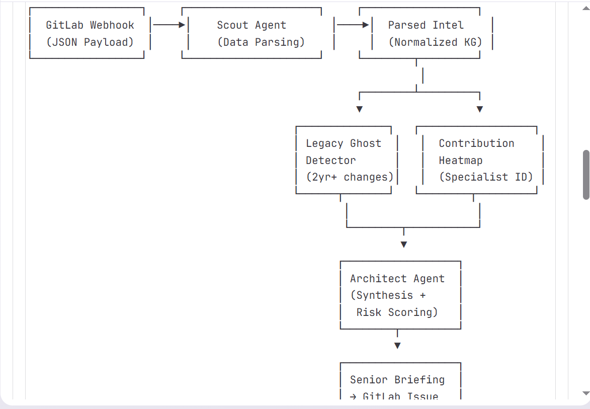 Ingest: Maps the GitLab Knowledge Graph out to a Level-2 depth (Issue → MRs → Files → Commits & CVEs). Reason: A Google Antigravity-powered Node performs four critical analyses: Legacy Ghost Detection: Finds heavily-relied-upon code logic pushed over 2 years ago in the dependency tree. Specialist Identification: Maps a 4-factor Contribution Heatmap (frequency, acceptance, recency decay, and file specificity) to find the absolute best developer to pair with. Temporal Correlation: Links previous CVEs to current files even if function names have changed. Danger Scoring: Compiles a 0-100 risk score matrix based on historical reverts and fan-out. Synthesis: Outputs a structured, professional, evidence-backed Markdown comment directly to the GitLab issue.