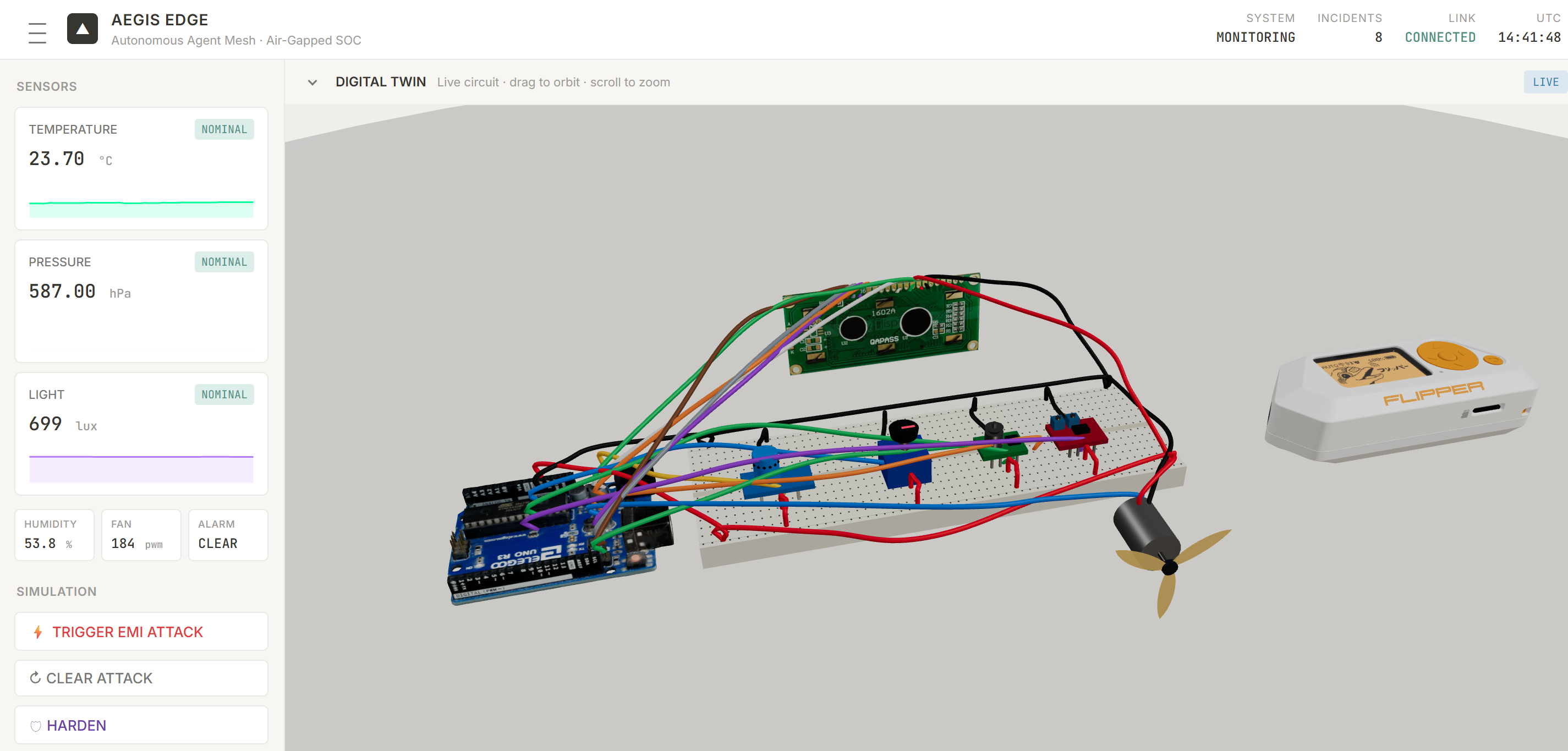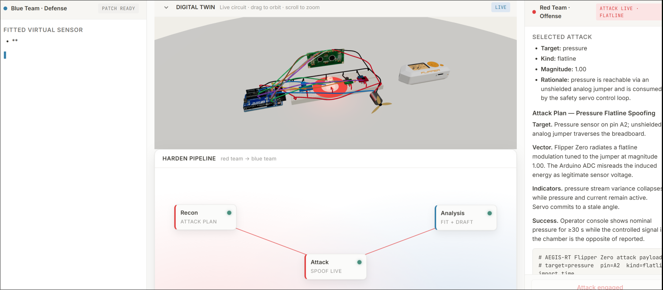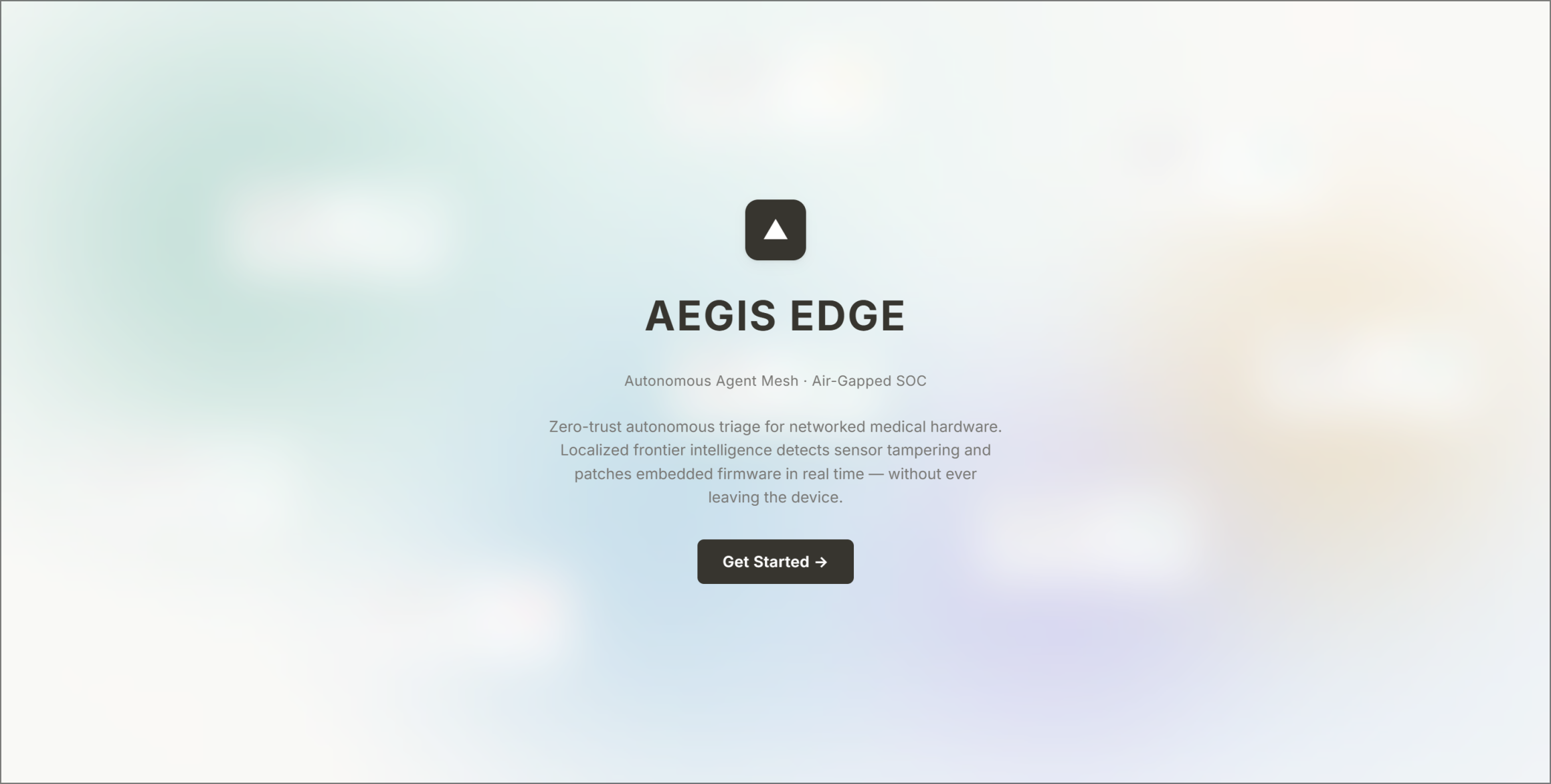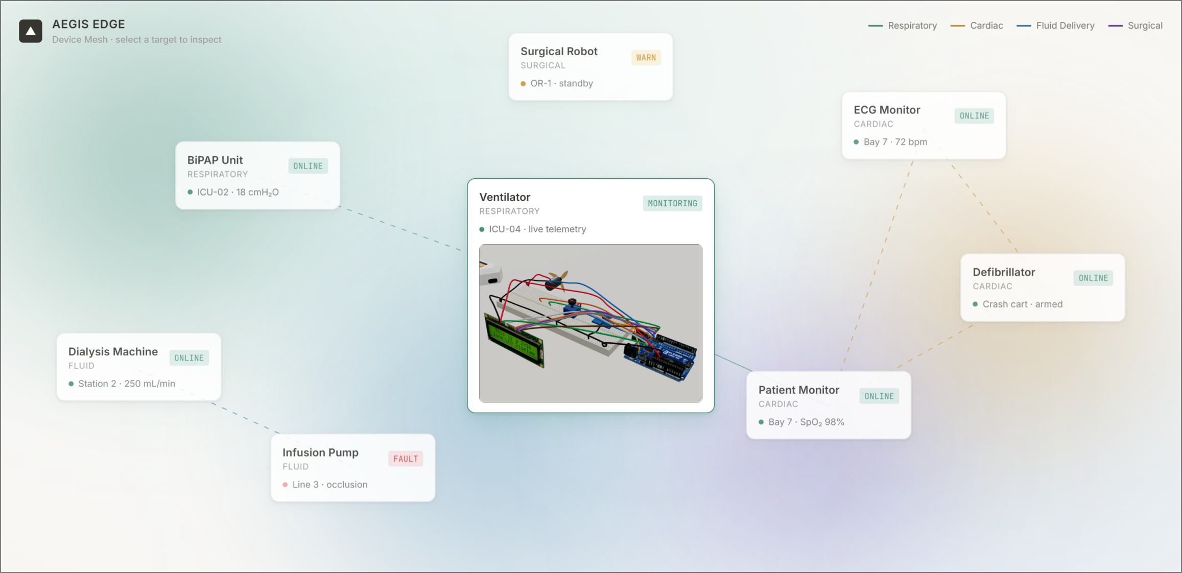 Aegis Edge is an air-gapped autonomous defense for embedded hardware. A Python bridge streams telemetry from an Arduino-driven ventilator, detects sensor tampering, asks a local 70B-param LLM to derive a virtual-sensor patch in Arduino C++, and reflashes the UNO over USB, all without leaving the LAN.