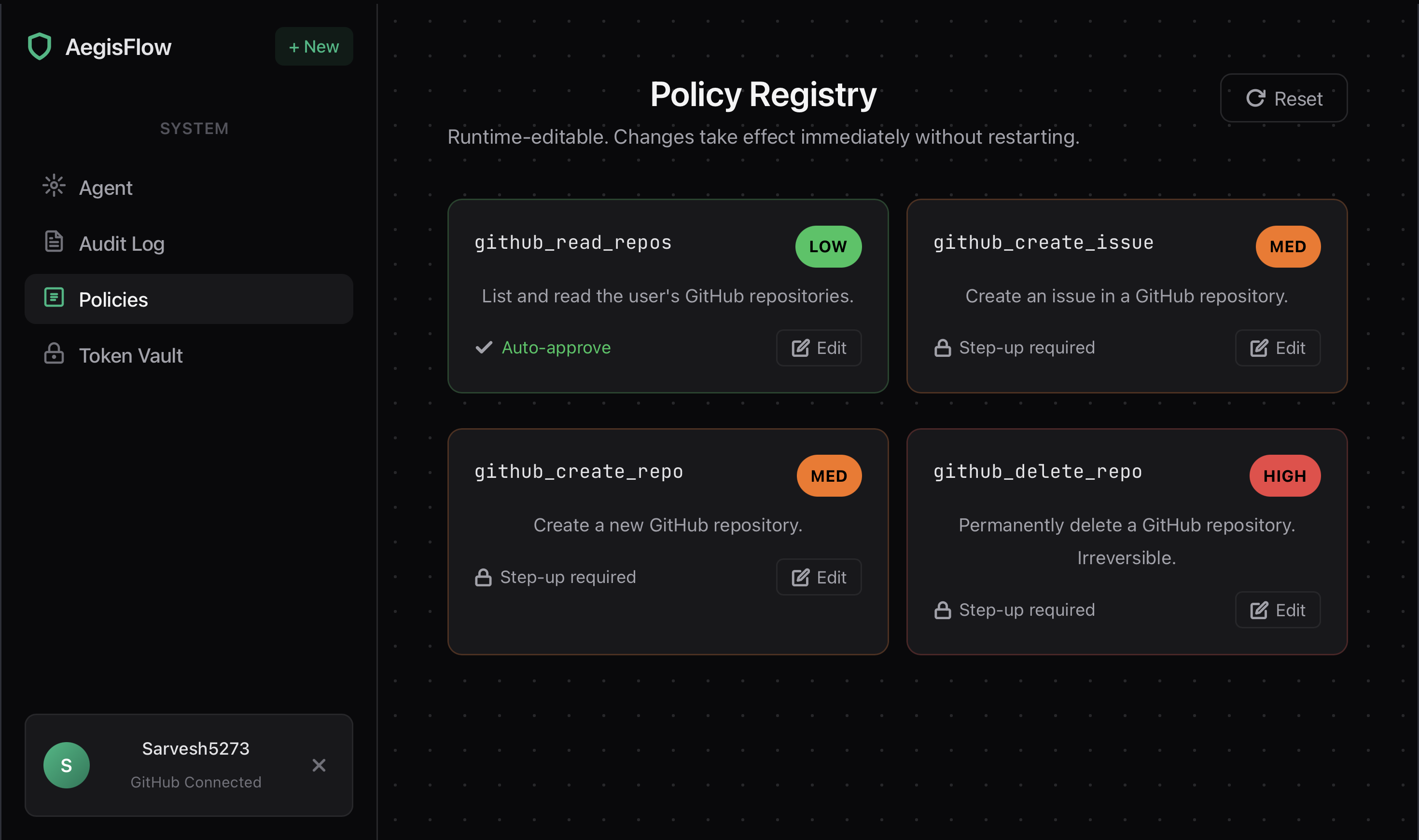 - ** Policy Registry** — runtime-editable policies, change risk levels live without restarting
