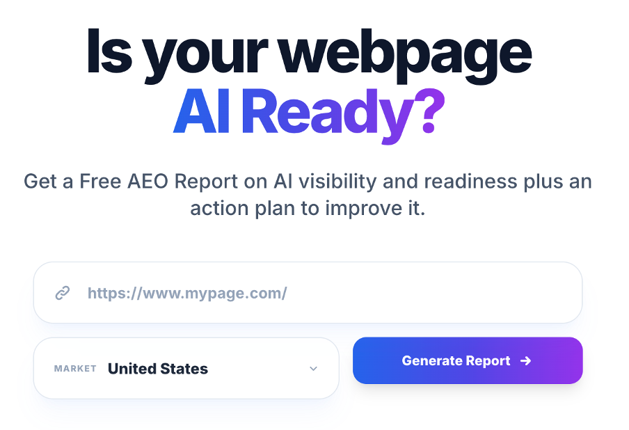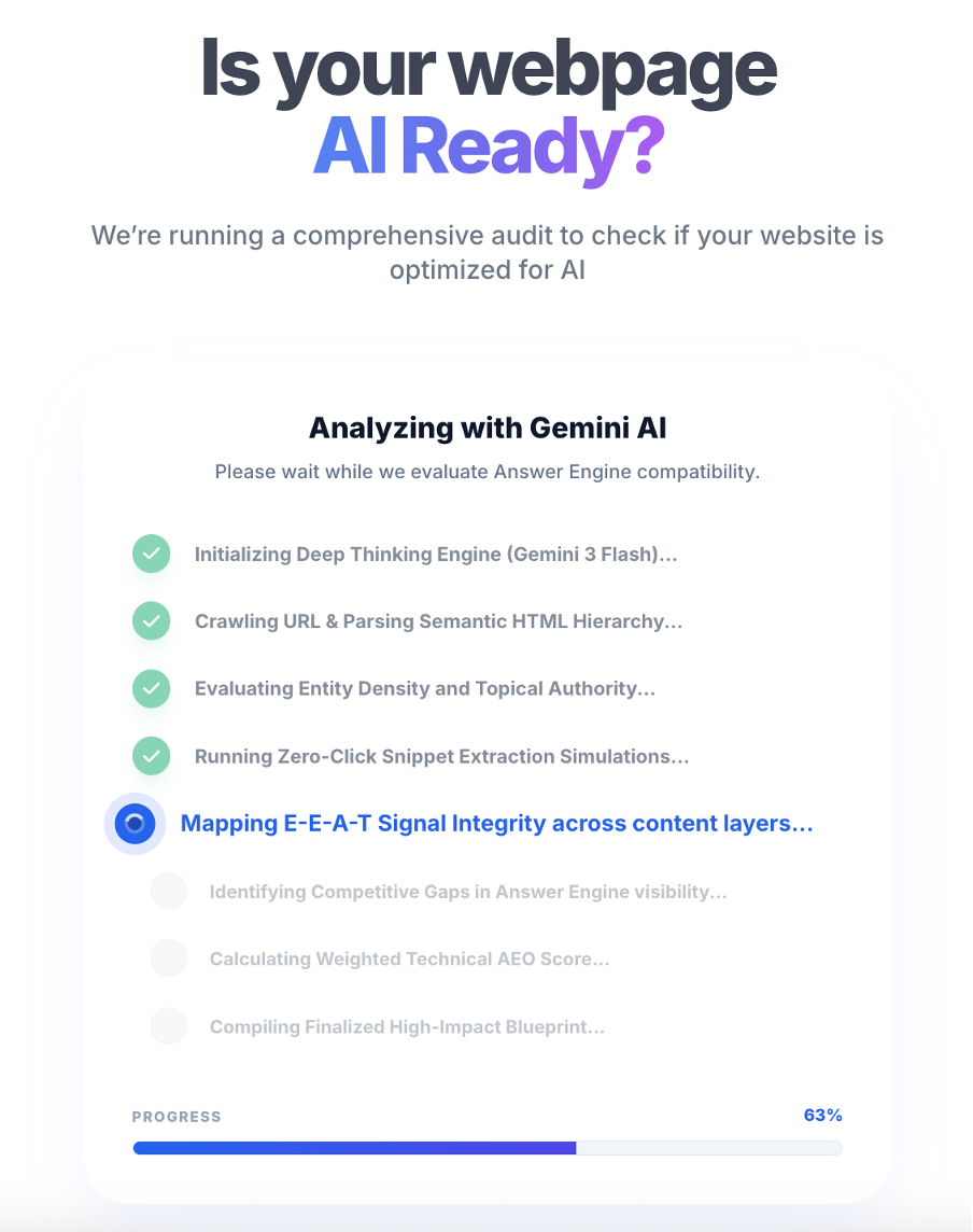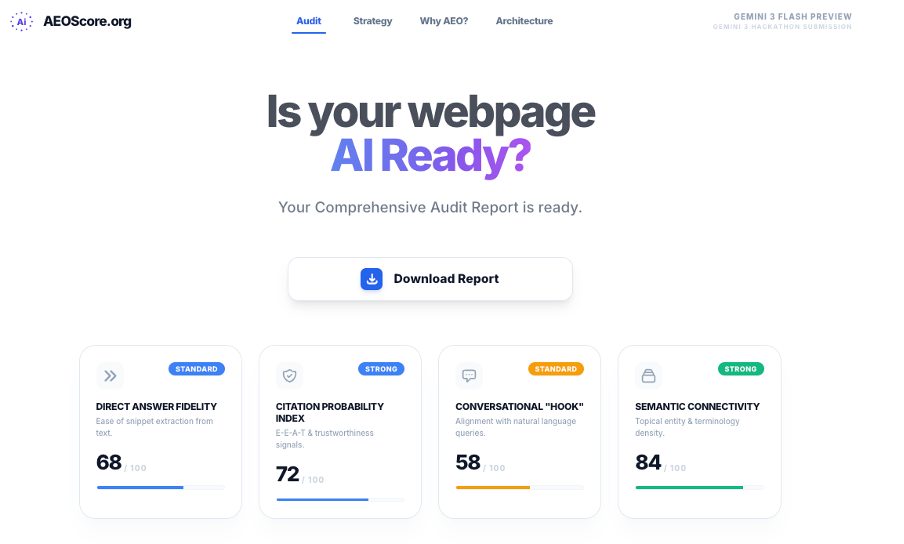 Summary of what the tool does Scans your page: It looks at your website through the "eyes" of an AI. Gives you a score: It tells you how likely an AI is to use your website as its primary source. Provides a "To-Do" list: It gives you simple, step-by-step instructions on what to change (like rewriting a summary or fixing a technical setting) so AI starts citing you.
