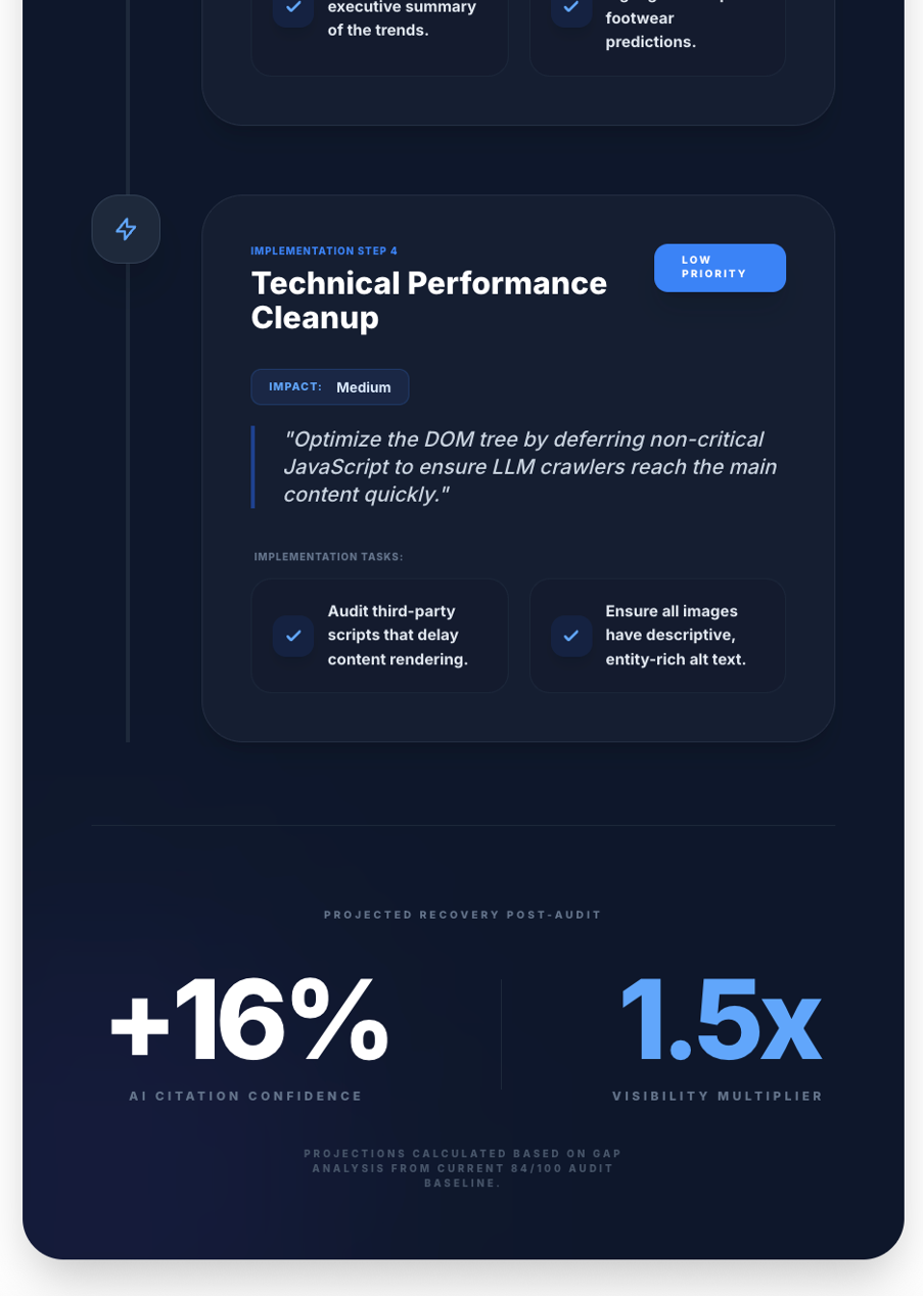 - 25% Citation Probability Index (CPI): Measures "trustworthiness" signals (Author E-E-A-T, updated dates, and factual density) for citation confidence.