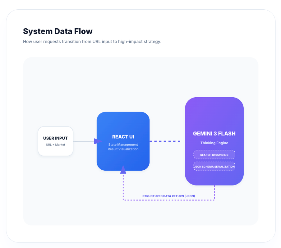 Key Configurations: Google Search Grounding for real-time URL crawling. Strict Response Schema (JSON) for frontend typing integrity. Weighted scoring logic enforced via System Instructions.