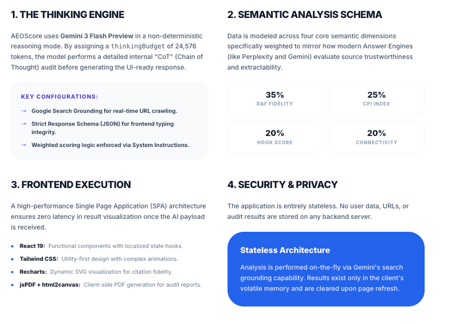 "Summary on Gemini 3 integration" AEOScore uses Gemini 3 Flash Preview in a non-deterministic reasoning mode. By assigning a thinkingBudget of 24,576 tokens, the model performs a detailed internal "CoT" (Chain of Thought) audit before generating the UI-ready response.
