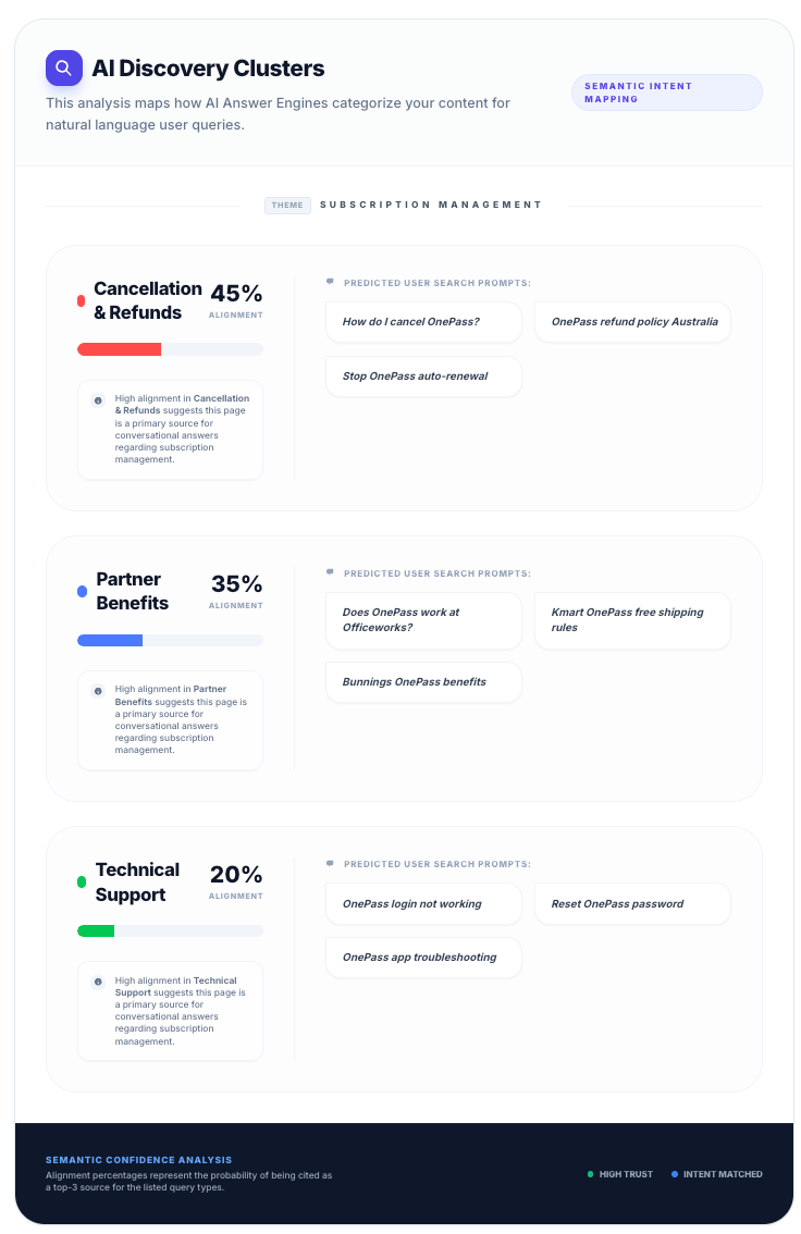 - 20% Conversational "Hook" Score: Measures how well the content matches natural language queries (long-tail "How," "Why," and "Should I" questions).